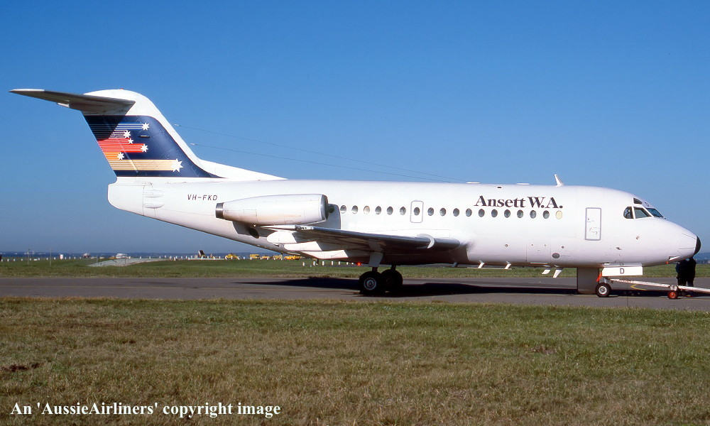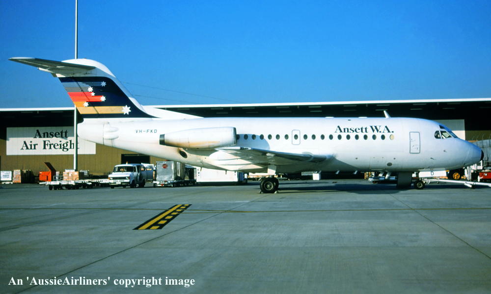 VH-FKD. Ansett W.A. - in the 'Southern Cross' livery at Sydney Kingsford Smith Airport, May 28, 1985. (R. N. Smith Copyright Image 1995-263.) |