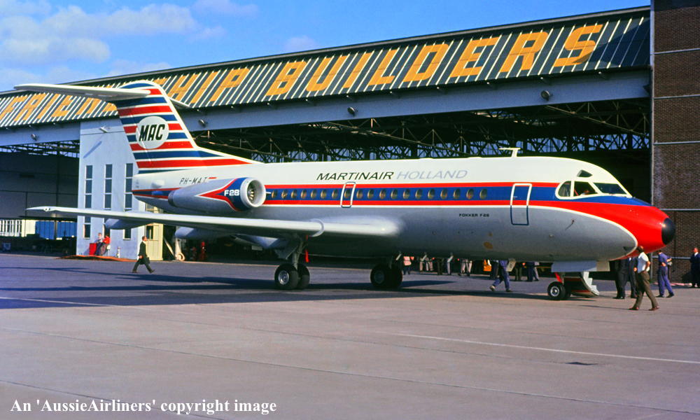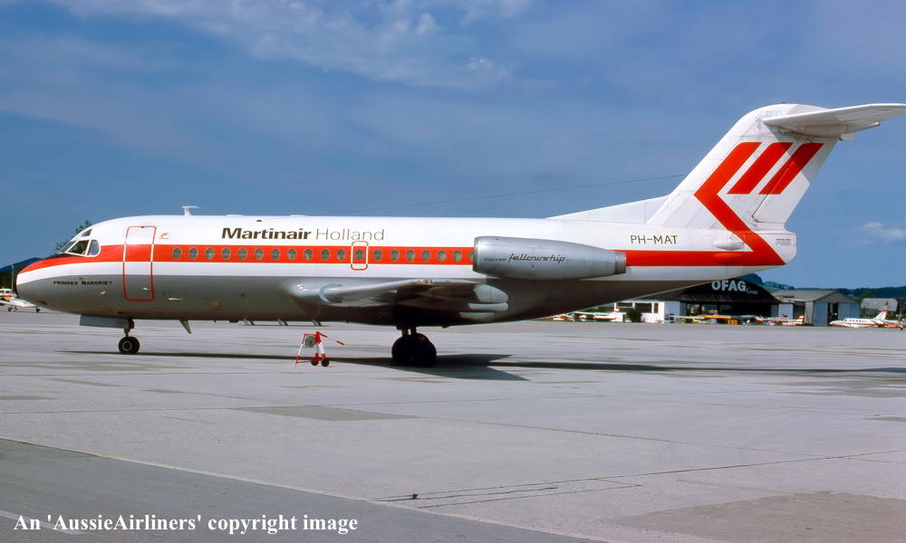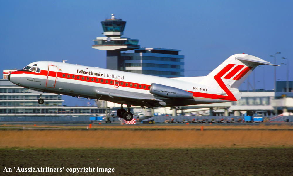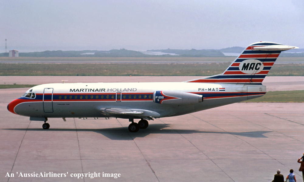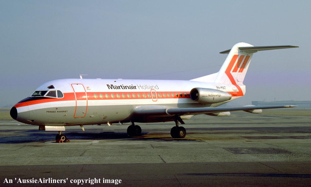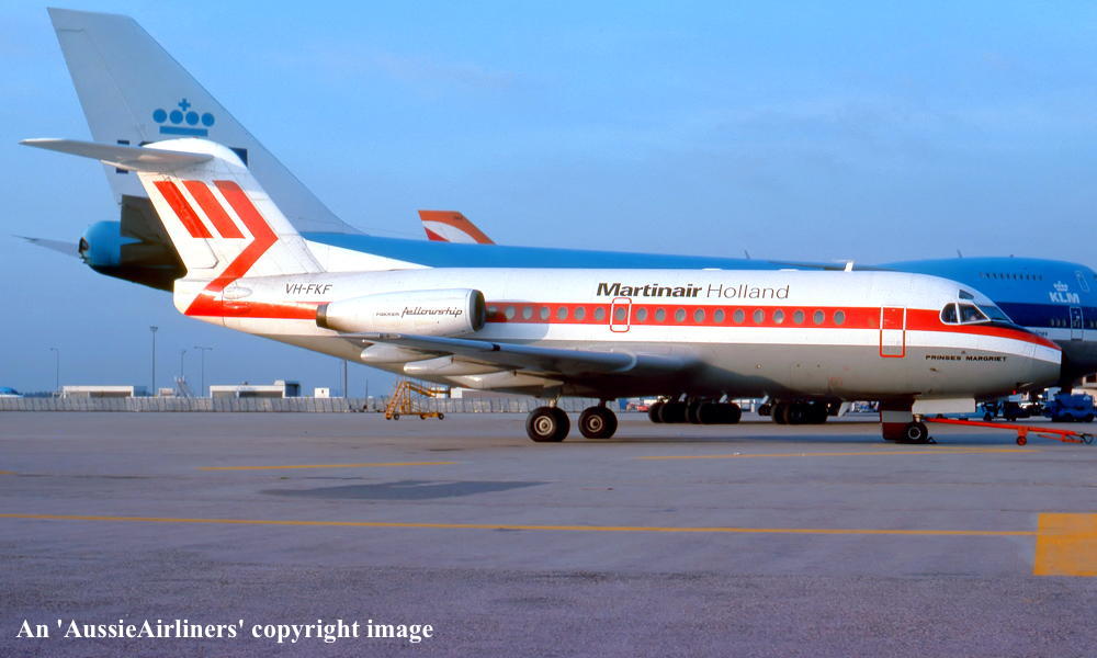 Entered onto the Dutch Aircraft Register as PH-MAT (CofR1525) - August 04, 1969 Registered to NV Kon. Ned. Vliegtuigenfabriek Fokker First flown as 'PH-MAT' - August 05, 1969 Leased to Martinair, Holland - October 01, 1969 The aircraft was named 'Princes Margriet' Registered to NV Kon. Ned. Vliegtuigenfabriek Fokker - March 20, 1970 Leased to Linjeflyg as the registered operator - March 21, 1974 Returned to Martinair at the nd of the lease - May 10, 1974 Leased to Air France as the registered operator - June 03, 1974 Returned to Martinair at the end of the lease - June 13, 1974 Leased to Linjeflyg as the registered operator - March 07, 1975 Returned to Martinair at the end of the lease - April 25, 1975 Leased to Linjeflyg as the registered operator - March 11, 1976 Returned to Martinair at the end of the lease - August 16, 1976 Leased to Linjeflyg as the registered operator - November 01, 1976 Operated its last revenue service with Linjeflyg - December 19, 1976 Returned to Martinair at the end of the lease - December 20, 1976 Leased to Air Alsace as the registered operator - February 24, 1980 Returned to Martinair at the end of the lease - March 28, 1980 Registered to NV Kon. Ned. Vliegtuigenfabriek Fokker - August 26, 1980 Registered to Martinair Holland NV - September 30, 1980 Cancelled from the Dutch Aircraft Register - September 30, 1980 Entered onto the Australian Aircraft Register as VH-FKF - September 30, 1980 Registered to Ansett Transport Industries (Operations) Pty Ltd, Melbourne Sold to Martinair Holland - October 01, 1980 Sold to Ansett Transport Industries - October 01, 1980 The aircraft was configured for 60 passengers in economy class seating Departed Amsterdam on the ferry flight to Australia in the Martinair livery - October 01, 1980 It arrived Melbourne (Tullamarine) on completion of the ferry flight - October 06, 1980 Ferry route: Amsterdam - Brindisi - Cairo - Bahrain - Karachi - Delhi - Calcutta - Bangkok - Singapore - Denpasar - Darwin - Alice Springs - Melbourne Flight crew: Captains J. Murray, N. Dorrington, B. Poole; Navigator W. C. Kennedy; Engineers B. Birt, D. Jarman Ferried Melbourne (Tullamarine) - Perth on delivery to MMA - December 12, 1980 The aircraft was named 'RMA Greenough' Operated its first MMA revenue service - December 14, 1980 MacRoberstson Miller Airlines was renamed Airlines of Western Australia - July 01, 1981 Airlines of Western Australia was renamed Ansett W.A. - October 01, 1984 It was painted into the Ansett 'Southern Cross' livery with 'Ansett N.T'. titles - August 1985 Returned to Ansett W.A. - April 18, 1991 Transferred to Ansett Australia - July 01, 1993 Operated its final revenue service Mackay - Brisbane as AN277 - March 30, 1995 It was officially withdrawn from service at Brisbane Ferried Brisbane - Melbourne (Tullamarine) for storage Cancelled from the Australian Aircraft Register - August 28, 1995 The aircraft had flown 51,914 hours with 48,036 cycles It was scrapped at Melbourne (Tullamarine) - January 16 - 20, 1996 |