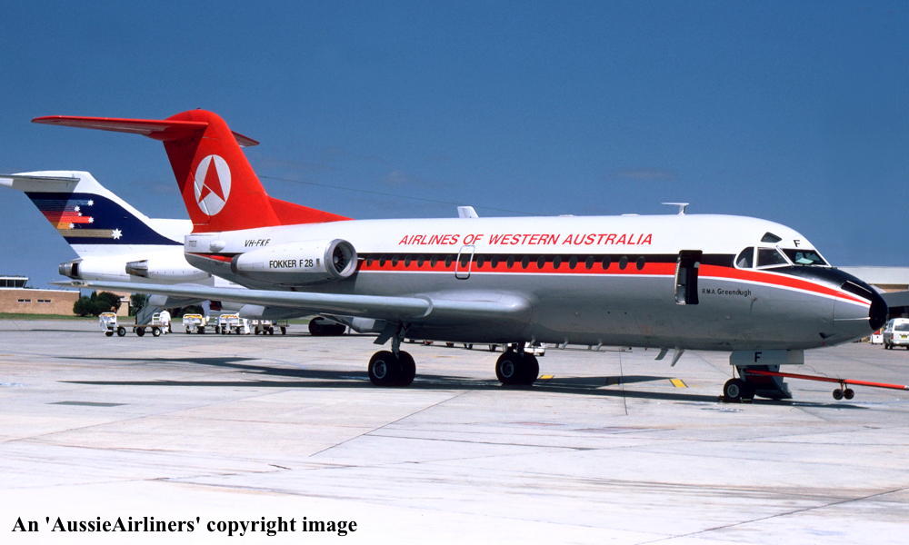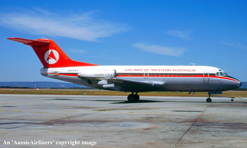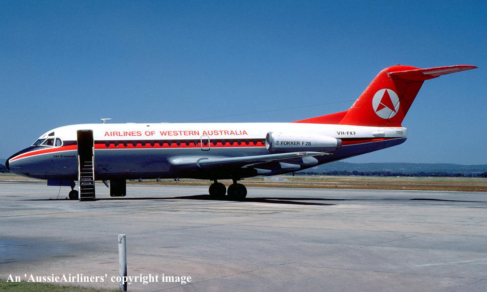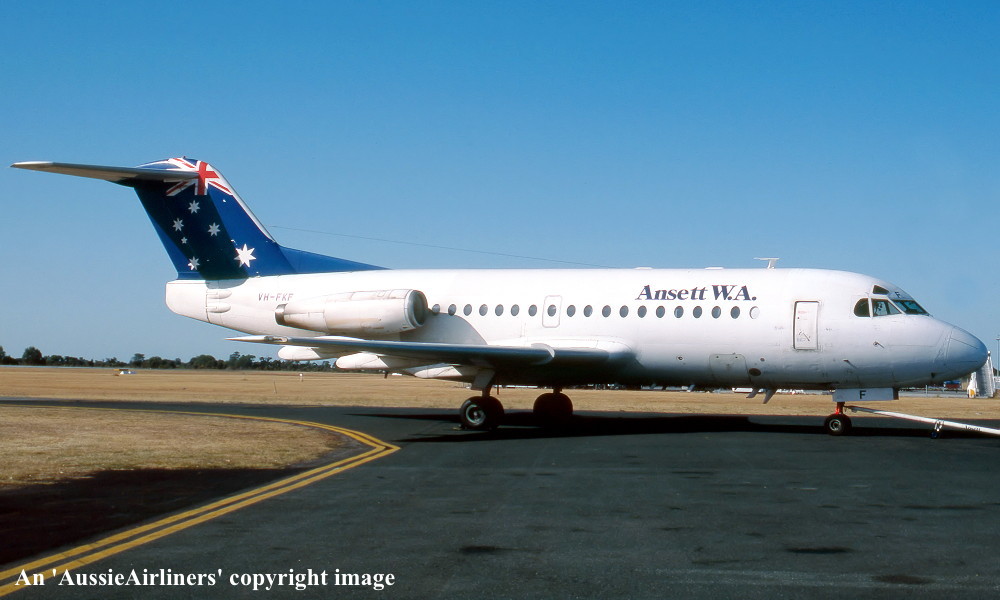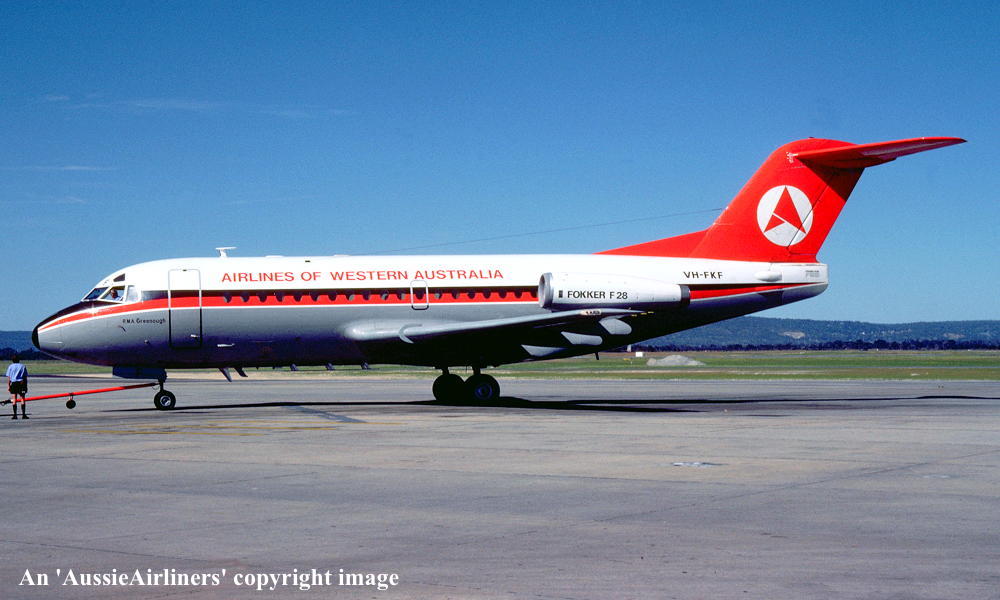 VH-FKF. Airlines of Western Australia - 'R.M.A. Greenough' in the Ansett 'delta' livery at Perth Airport, October 1983. (R. N. Smith Collection Copyright Image 1995-271.) |