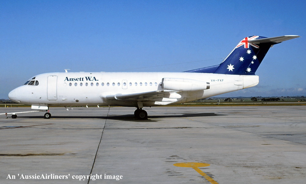 VH-FKF. Ansett W.A. - in the 'Union Jack' livery at Perth Airport, October 1992. (R. N. Smith Collection Copyright Image 1995-692.) |