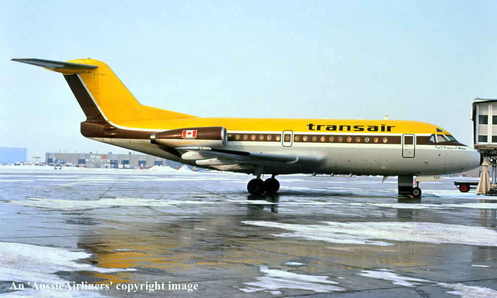 C-FTAY. Transair - in the old livery at an unknown airport, February 1978. (R. N. Smith Collection Copyright Image 1995-554.) |