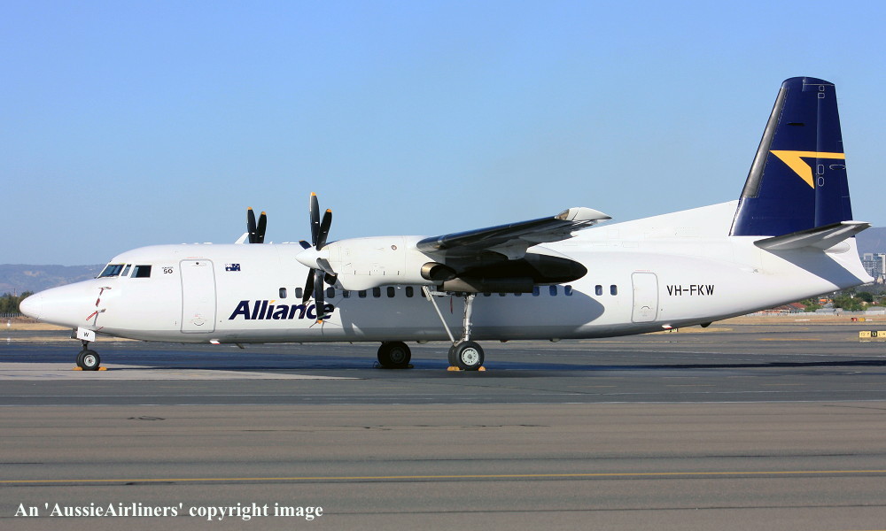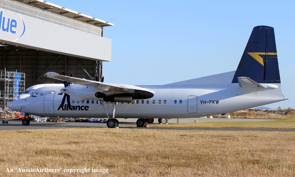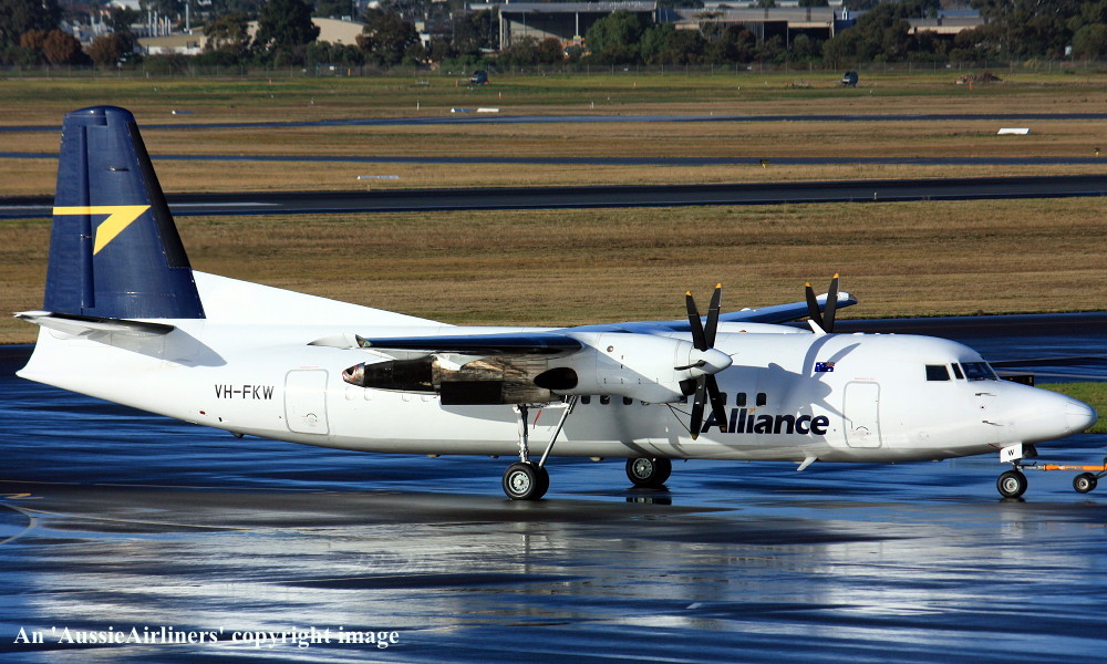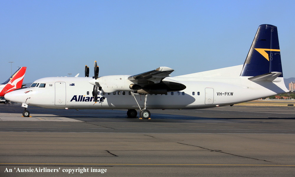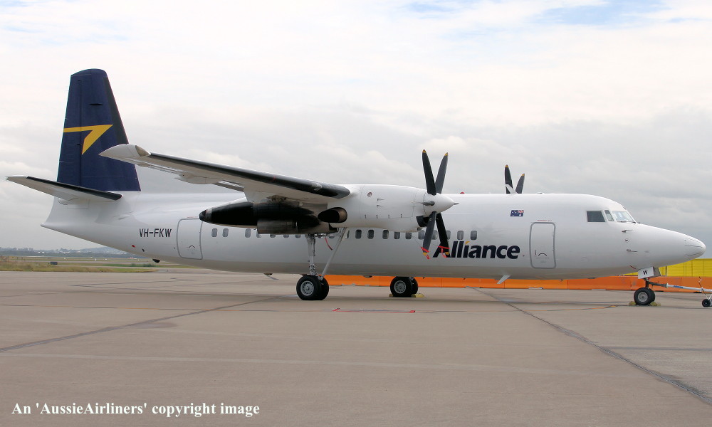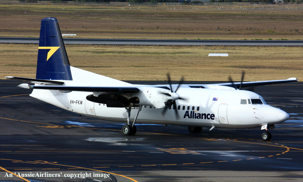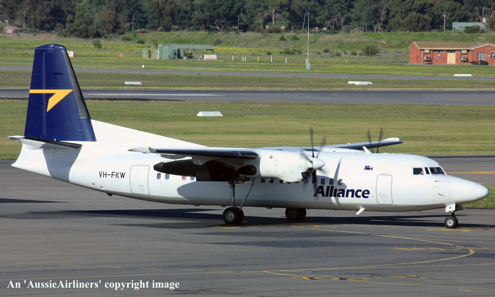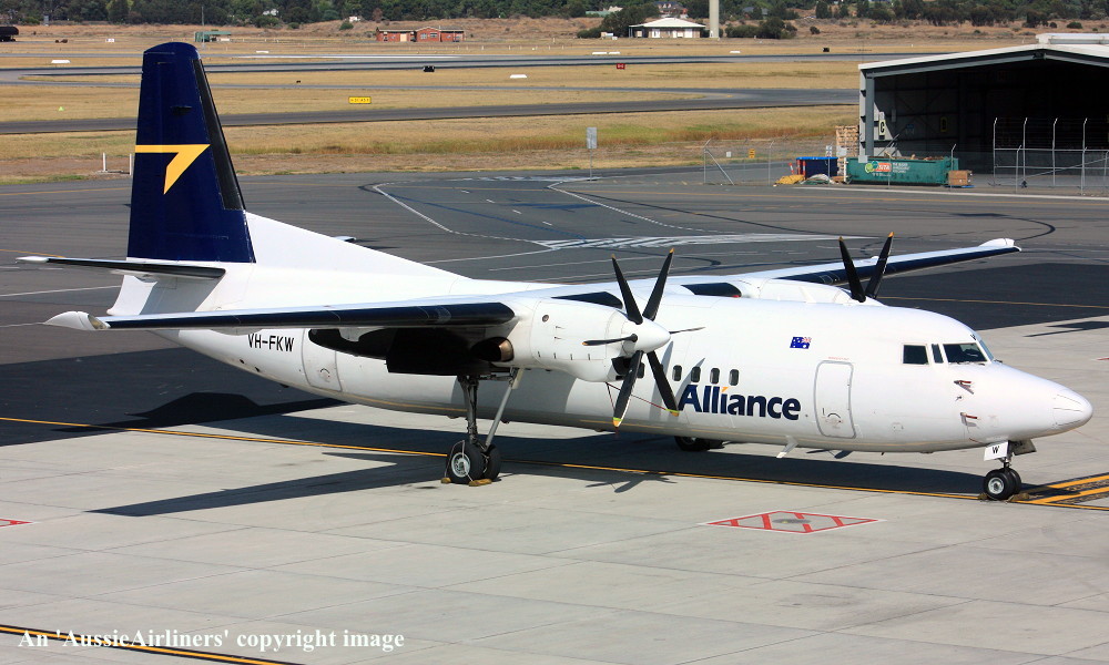 VH-FKW. Alliance - in the standard livery at Brisbane Airport, August 23, 2010. (R. N. Smith Collection Copyright Image 1997-528.) |