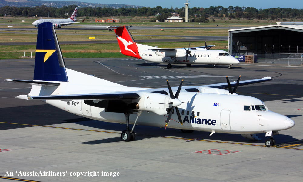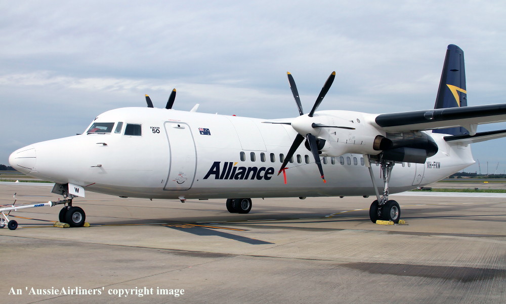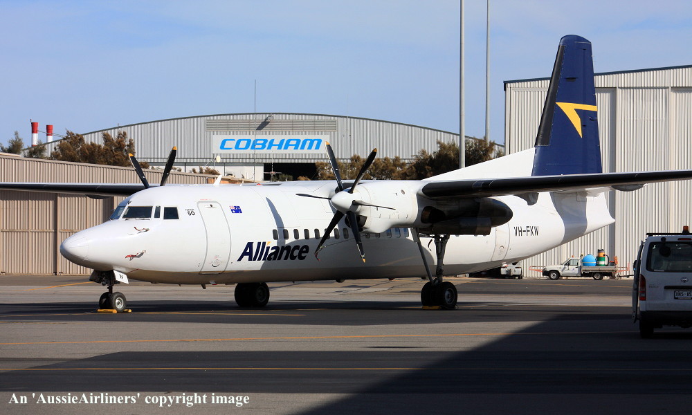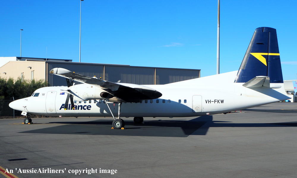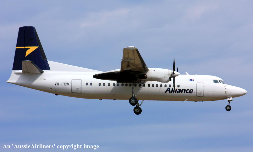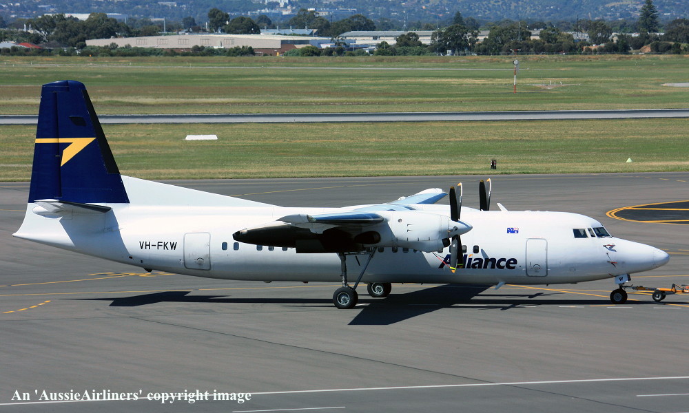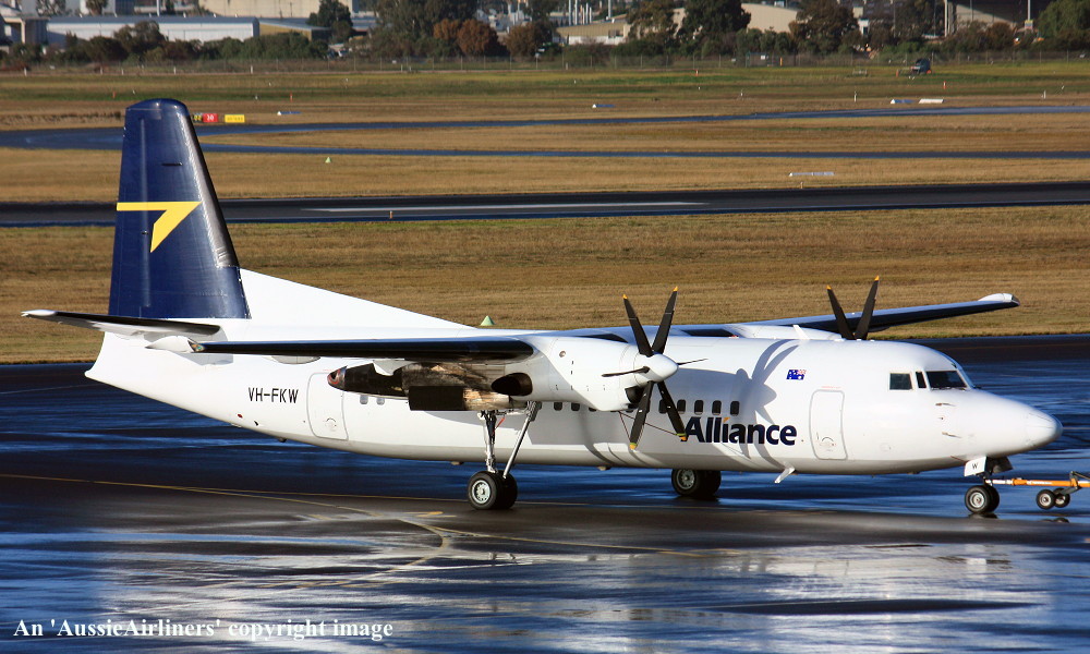 VH-FKW. Alliance - in the standard livery at Brisbane Airport, August 23, 2010. (R. N. Smith Collection Copyright Image 1997-528.) |