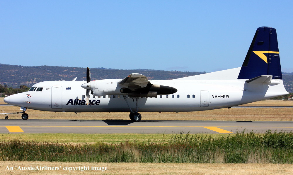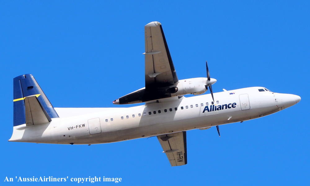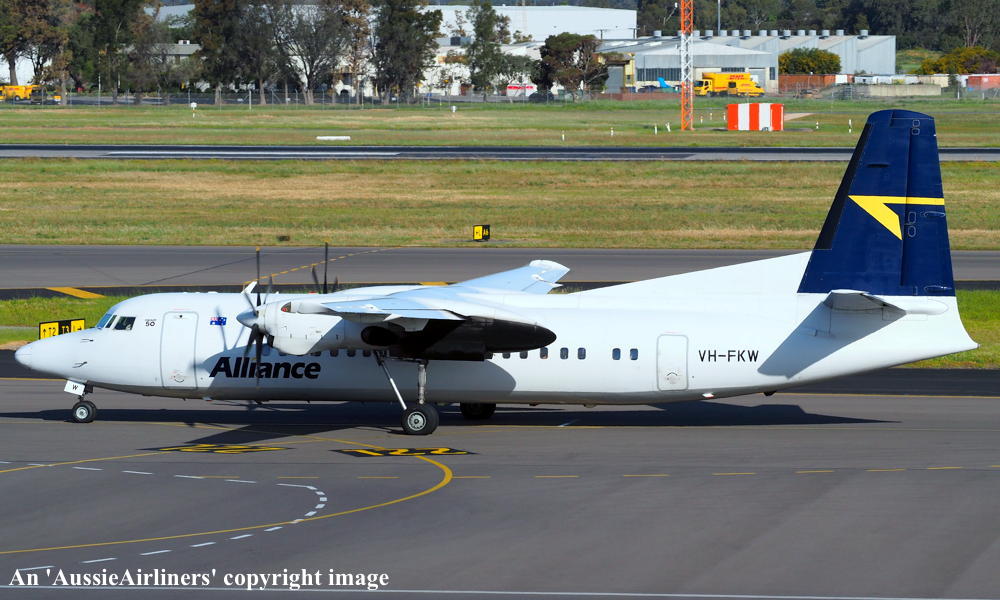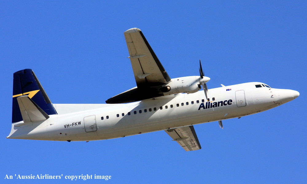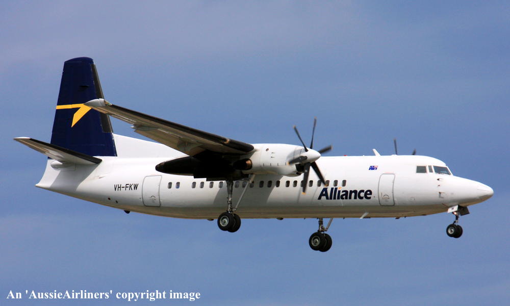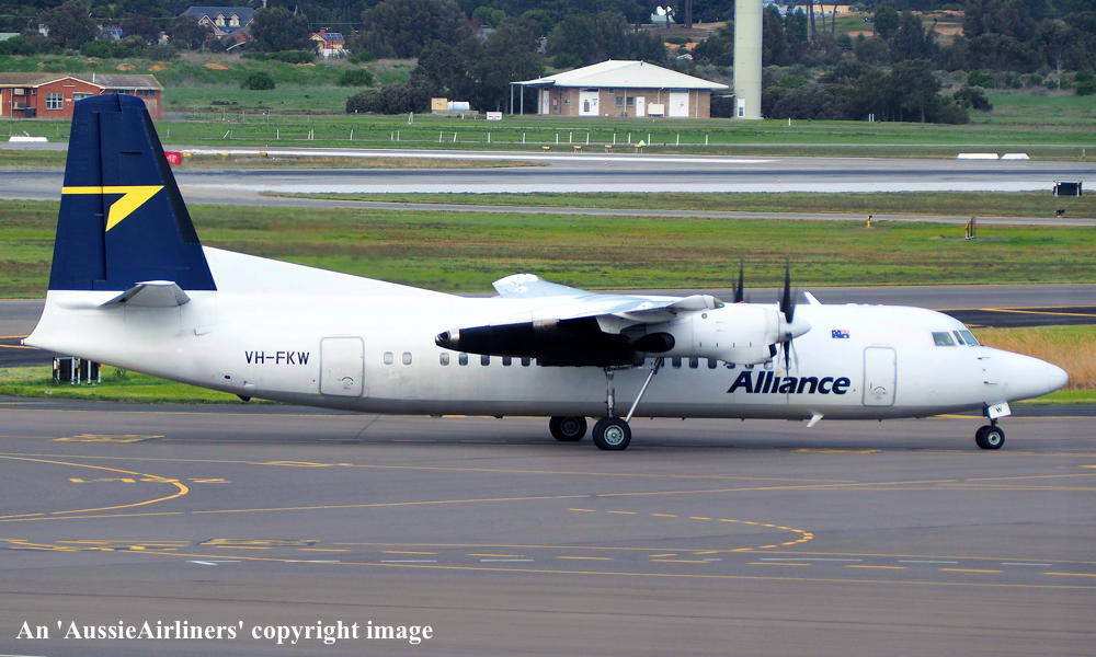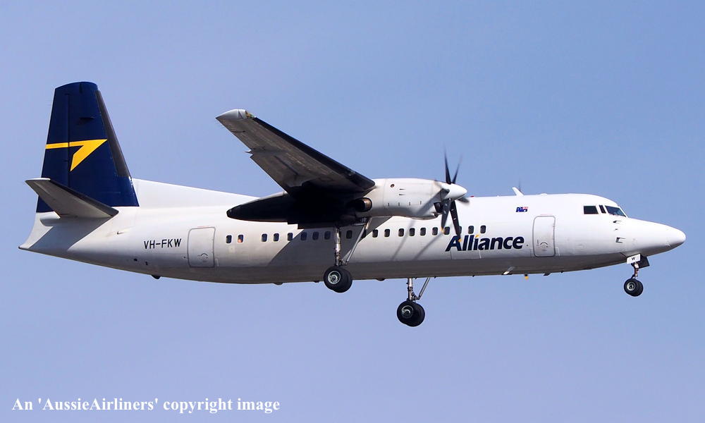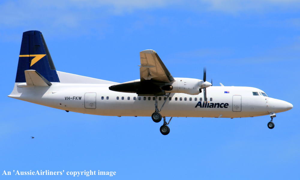 VH-FKW. Alliance - in the standard livery at Brisbane Airport, August 23, 2010. (R. N. Smith Collection Copyright Image 1997-528.) |