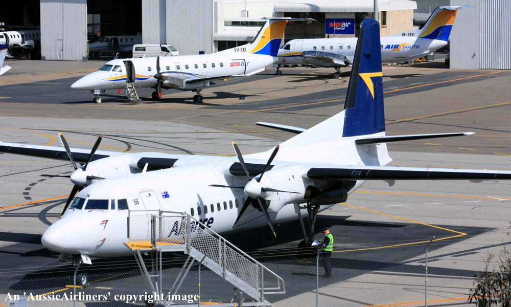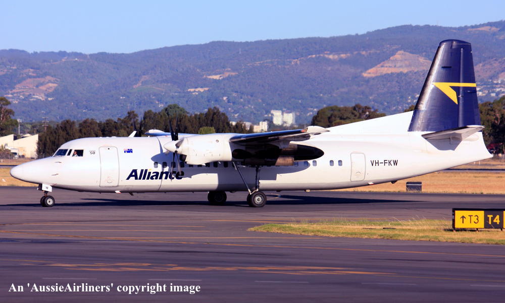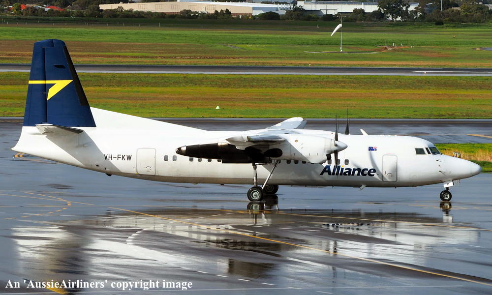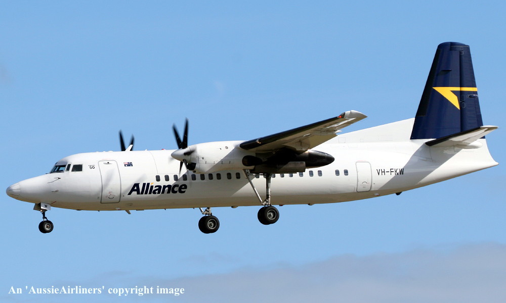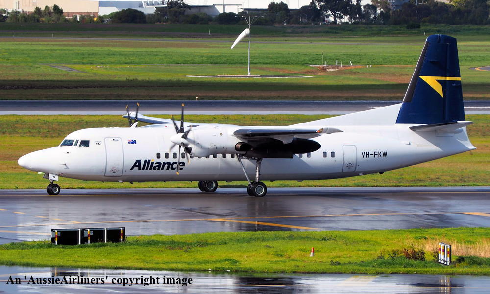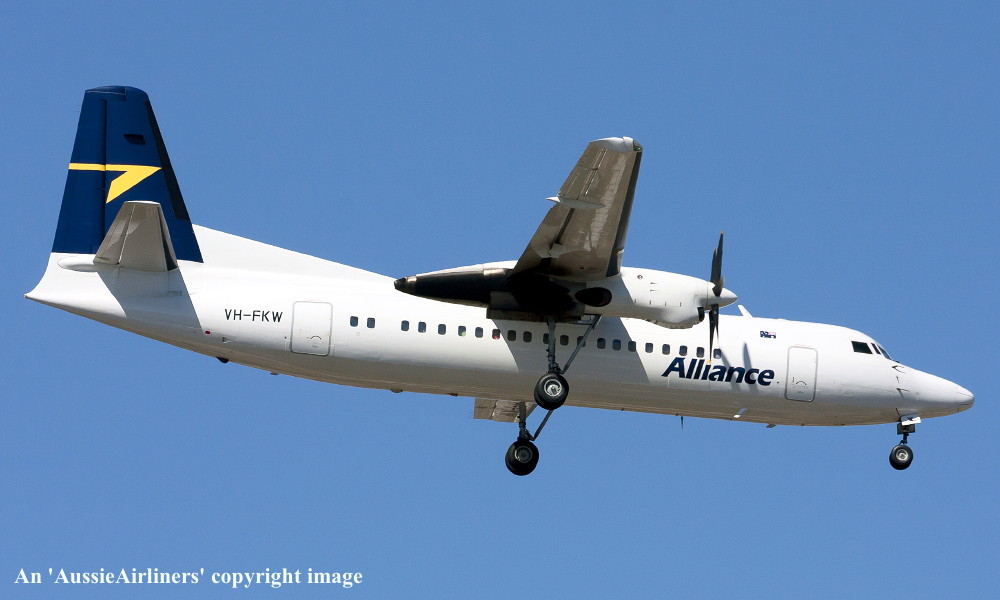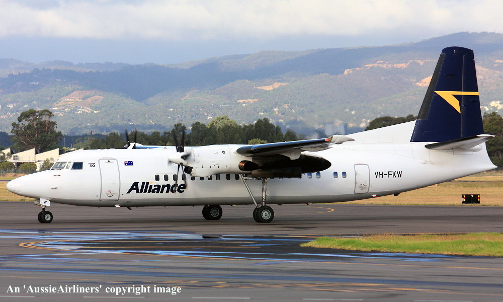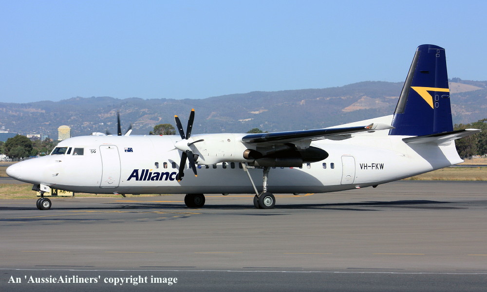 VH-FKW. Alliance - in the standard livery at Brisbane Airport, August 23, 2010. (R. N. Smith Collection Copyright Image 1997-528.) |