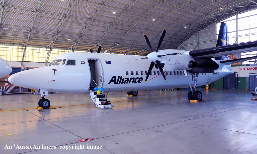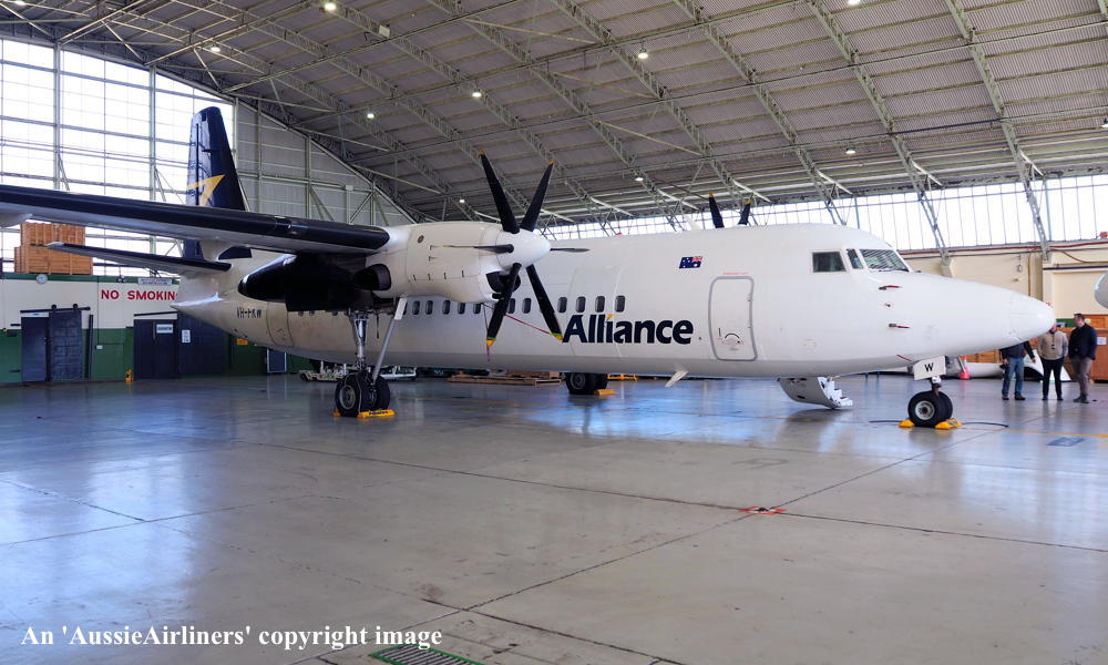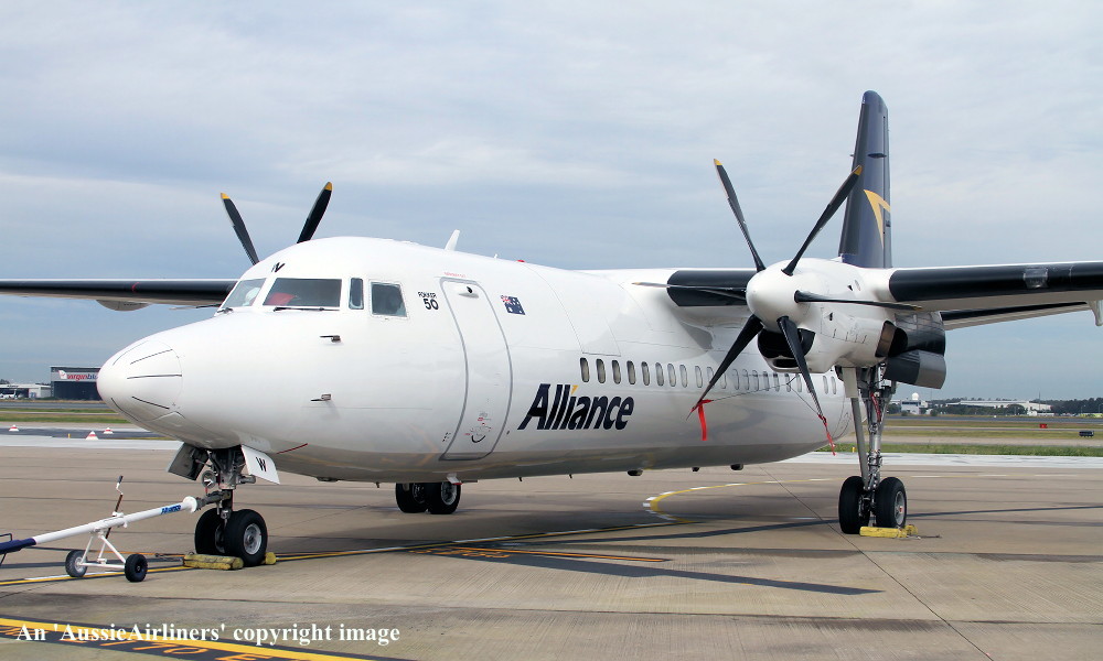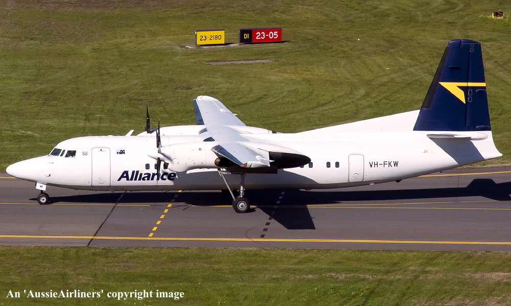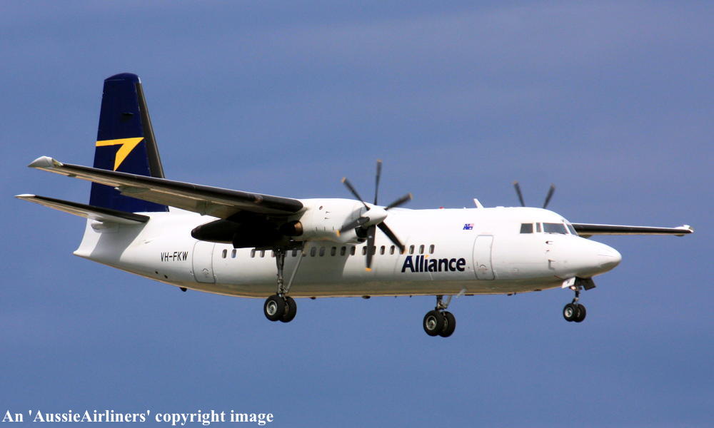 VH-FKW. Alliance - in the standard livery at Brisbane Airport, August 23, 2010. (R. N. Smith Collection Copyright Image 1997-529.) |