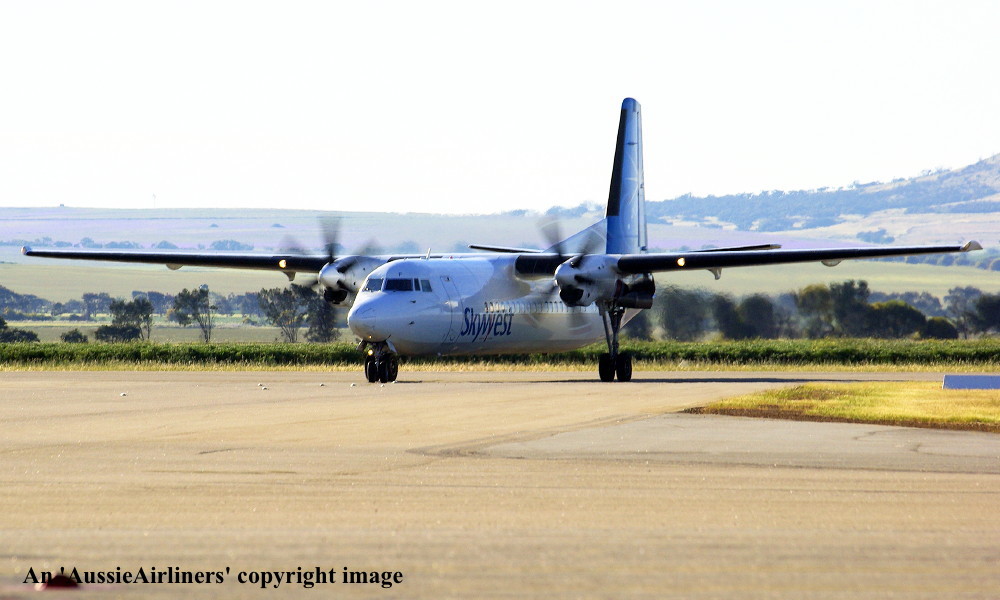 VH-FNF. Skywest - in the standard livery at Geraldton Airport, April 27, 2010. (R. N. Smith Collection Copyright Image 1997-128.) |