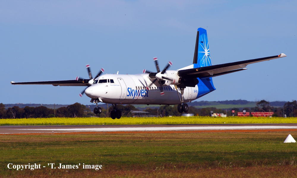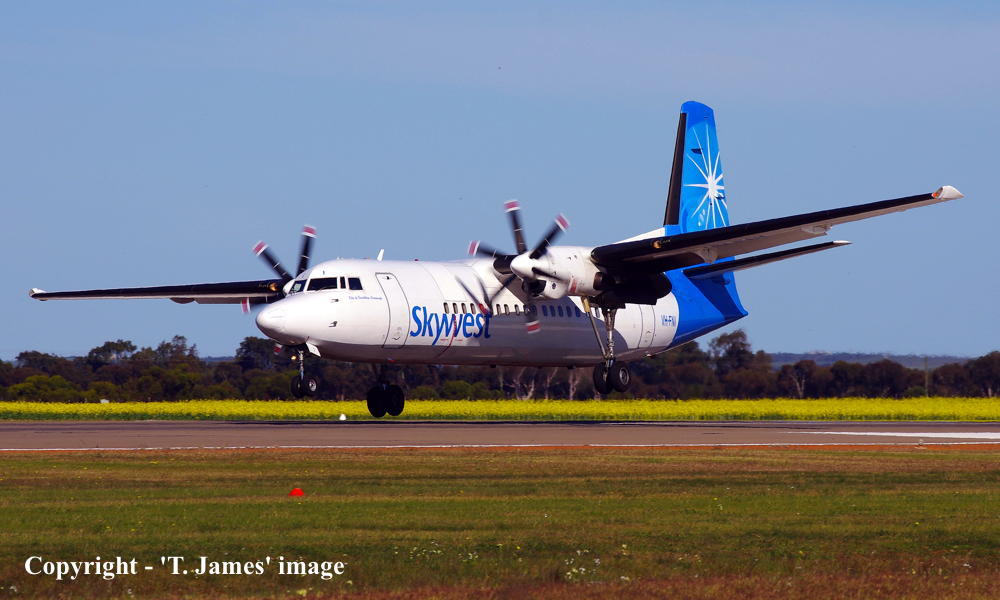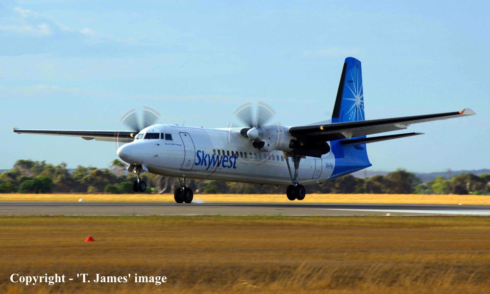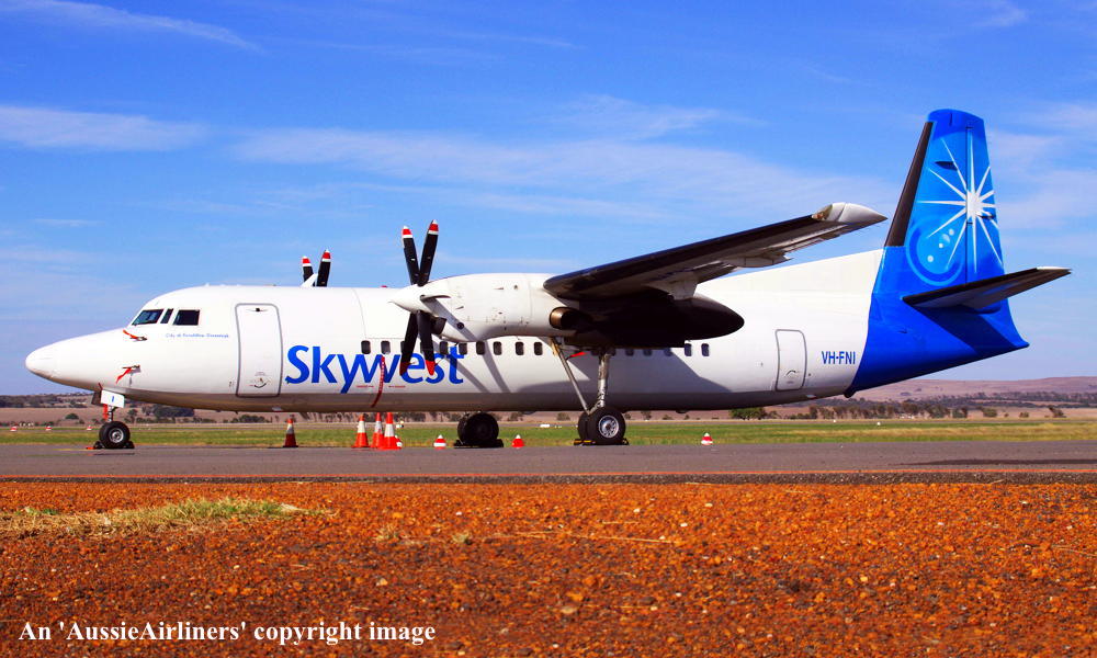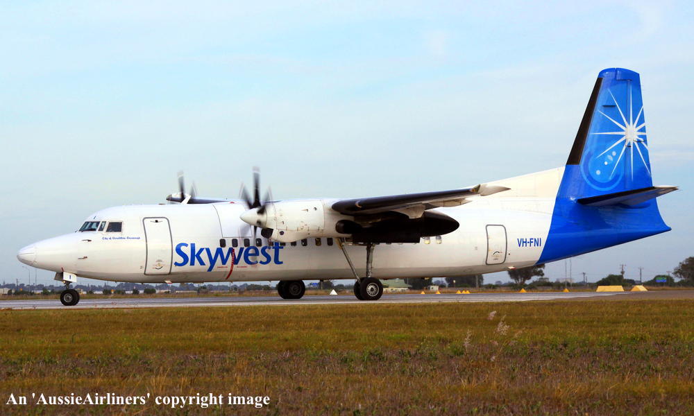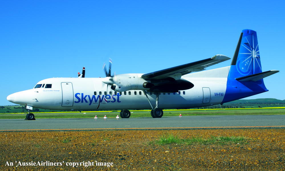 VH-FNI. Skywest - 'City of Geraldton' in the standard livery at Geraldton Airport, March 11, 2010. (T. James Copyright Image 1997-152.) |