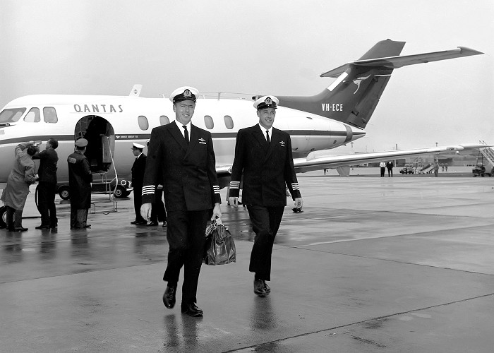 VH-ECE. Qantas - in the original livery arriving at Sydney Airport, June 15, 1966. From left to right: Capt Neilson and Capt Chaseling.
