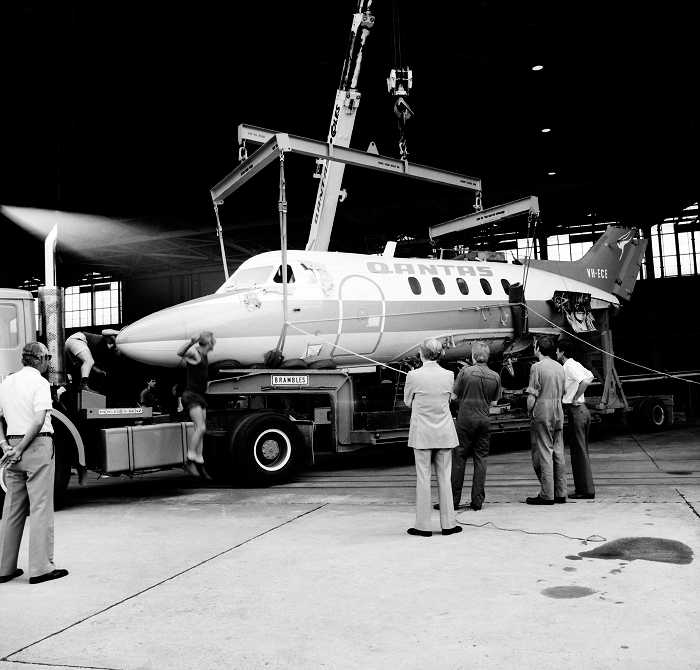 VH-ECE. Qantas - loaded on the truck at Sydney Airport, October 1981.