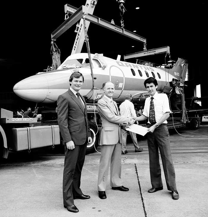 VH-ECE. Qantas - the Title Deeds being handed over to the new owner at Sydney Airport, October 1981.