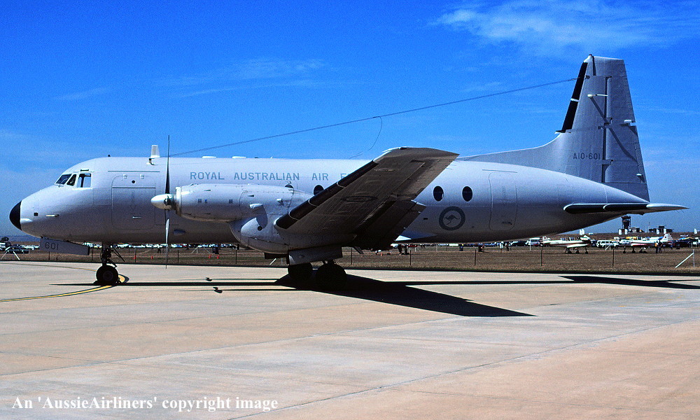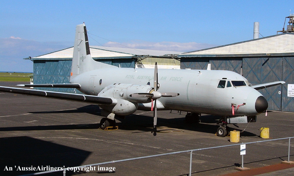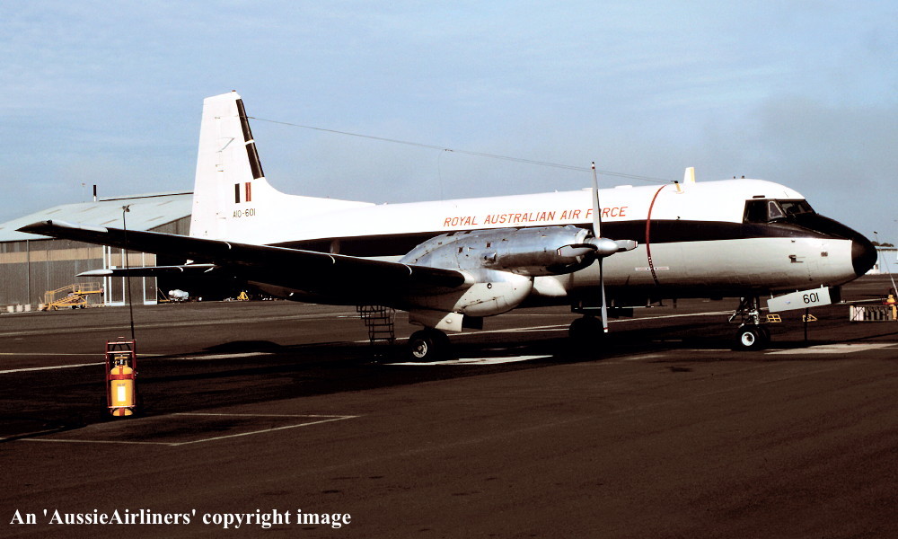 This aircraft was ordered new by the Australian Government for the Royal Australian Air Force It was constructed by Hawker Siddeley Aviation Limited, Woodford, Manchester - 1967 It was allocated the production number '108' Entered onto the British Aircraft Register as G-AVZD (CofR 9243/1) - December 06, 1967 Registered to Hawker Siddeley Aviation Limited, Woodford First flown as G-AVZD - February 21, 1968 Powered by Rolls Royce Dart 534 engines Certificate of Airworthiness (CofA) issued April 05, 1968 This aircraft was used to certify the Rolls-Royce Dart 8 engines Departed Woodford for tropical trials at Asmara, Eritrea via Rome and Nicosia - April 1968 Returned to Woodford on completion of the trials via Cairo - Malta - Nice - April 20, 1968 The development trials were completed - June 29, 1968 The aircraft underwent a major overhaul and refit to R.A.A.F. standards Cancelled from the British Aircraft Register - August 09, 1968 Accepted by the Royal Australian Air Force at Woodford as 'A10-601' - August 30, 1968 Departed England on the ferry flight to Australia - September 1968 Arrived RAAF East Sale on completion of the ferry flight - September 20, 1968 Ferry route: Woodford - Athens - ? - New Delhi - Bangkok - Singapore - Denpasar - Darwin - Alice Springs - East Sale The aircraft was allocated to the School of Air Navigation, RAAF East Sale Transferred to No 32 Squadron, RAAF East Sale - July 01, 1989 Withdrawn from use at RAAF East Sale and stored - ? The aircraft was allocated to the R.A.A.F. Museum at RAAF Point Cook for preservation Ferried RAAF East Sale - RAAF Point Cook (Melbourne) - January 20, 2004 The aircraft was stored in an overall grey livery It was later completely covered in a plastic protective coating to inhibit corrosion The aircraft is on display at RAAF Point Cook having flown 20,485 hours with 18,040 cycles |