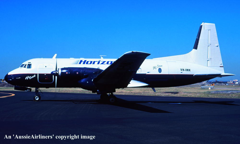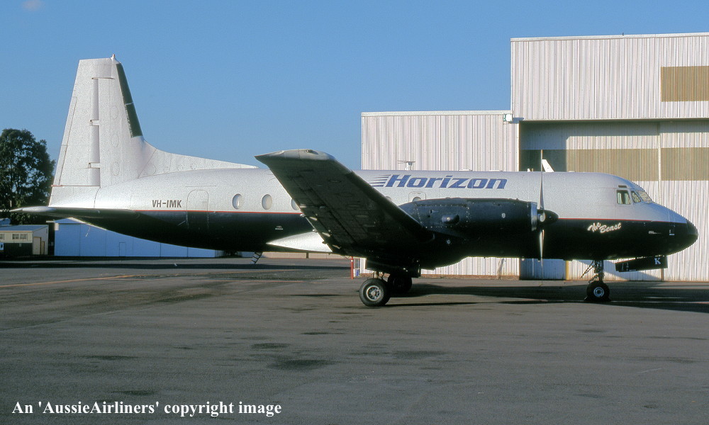 VH-IMK. Horizon - 'The Beast' in the basic British Airways livery at Sydney Kingsford Smith Airport, October 1999. (R. N. Smith Copyright Image 0748-131.) |