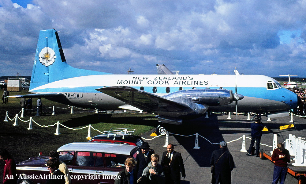 ZK-CWJ. New Zealand's Mount Cook Airlines - 'Aorangi' in the original livery at the Farnborough Airshow, September 1968. (R. N. Smith Collection Copyright Image 0748-032.) |