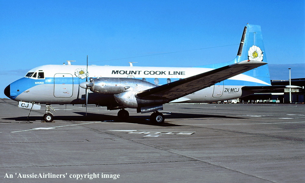 ZK-MCJ. Mount Cook Line - 'Rotorua' in the old livery at Auckland Airport, September 1982. (R. N. Smith Collection Copyright Image 0748-021.) |