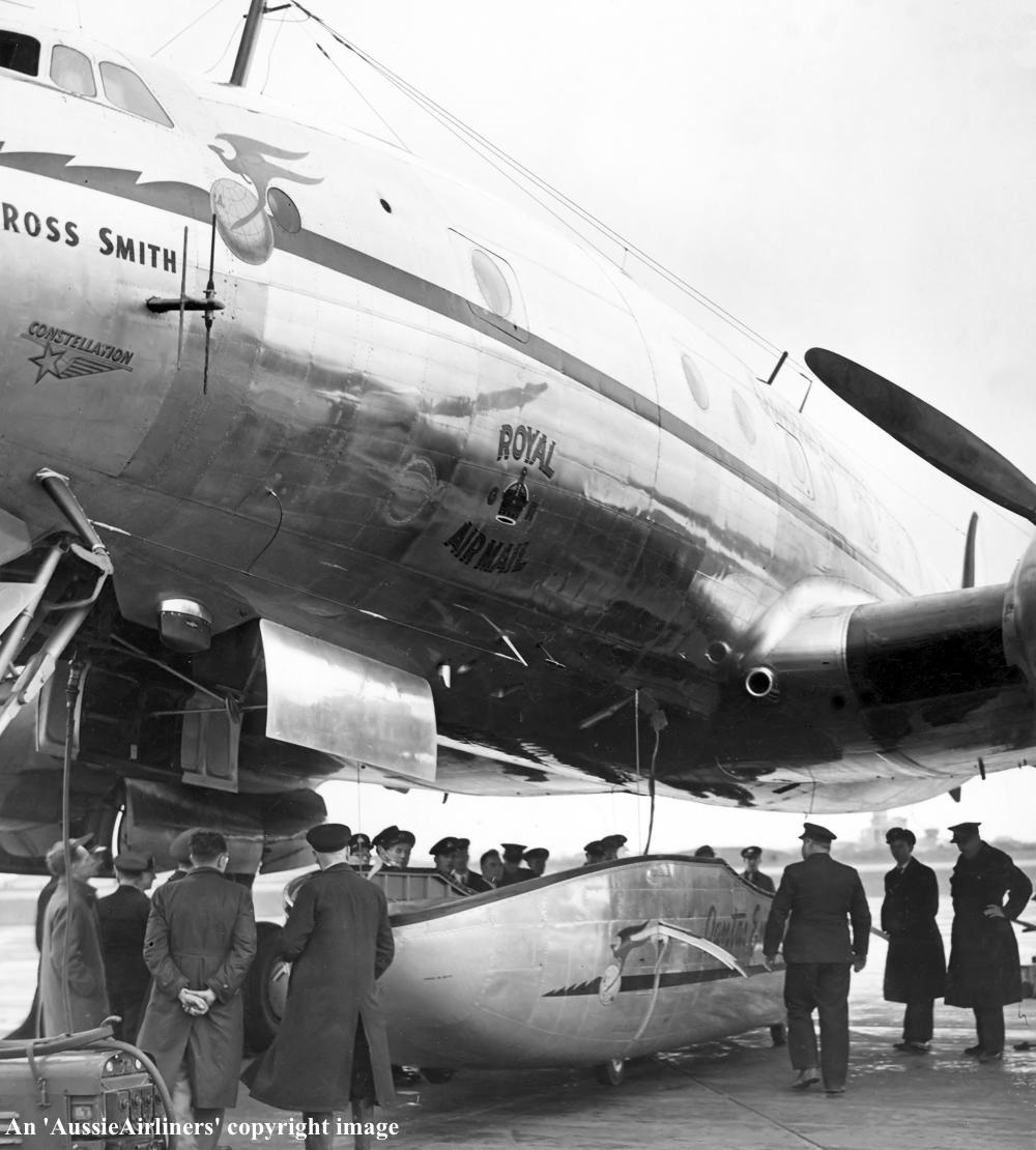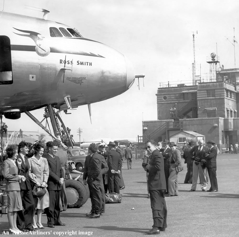 VH-EAA. Qantas Empire Airways - 'Ross Smith' in the original livery at Sydney Kingsford Smith Airport, October 14, 1947. (Qantas Heritage Collection Copyright Image 1802-106.) |