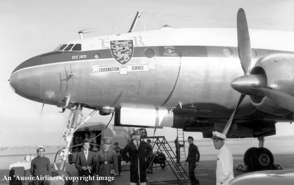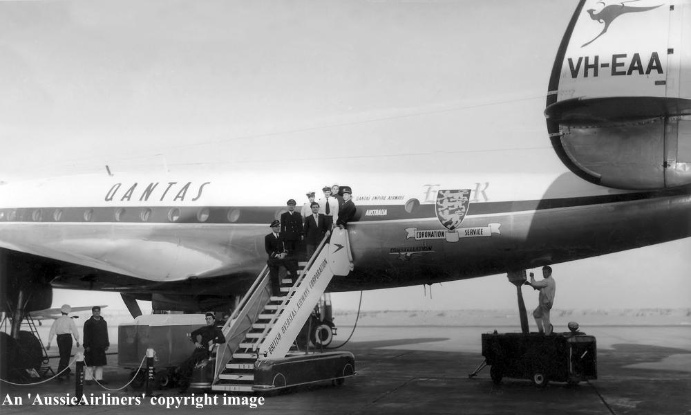 VH-EAA. Qantas - 'Ross Smith' in the revised livery with additional 'Coronation Service' titles at London Hearthrow Airport, circa 1953. (Qantas Heritage Collection Copyright Image 1802-108.) |