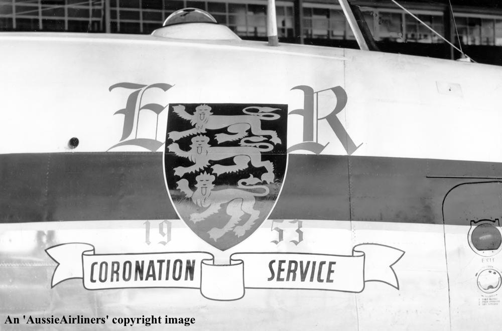 VH-EAA. Qantas - 'Ross Smith' in the revised livery with additional 'Coronation Service' titles at Sydney Kingsford Smith Airport, circa 1953. (Qantas Heritage Collection Copyright Image 1802-096.) |