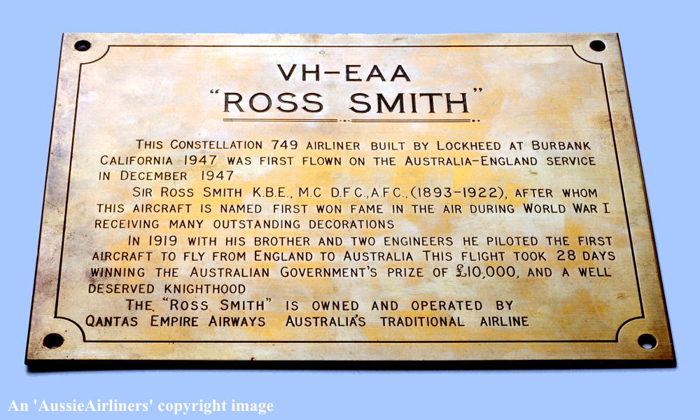 VH-EAA. Qantas - 'Ross Smith' - the aircraft's brass name plate. (Qantas Heritage Collection Copyright Image 1802-217.) |