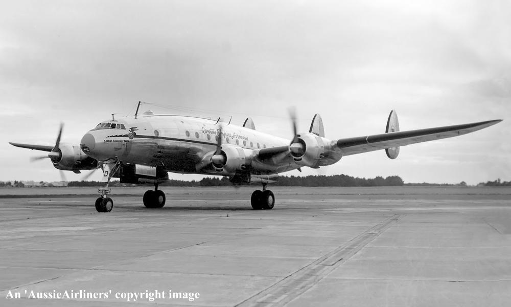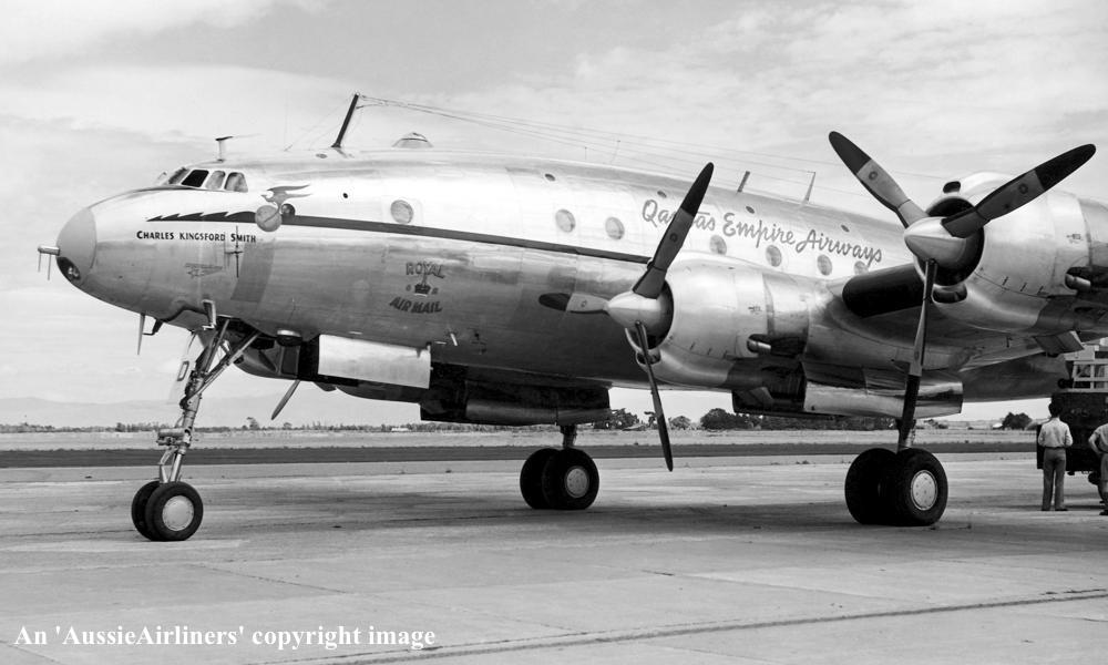 VH-EAD. Qantas Empire Airways - 'Charles Kingsford Smith' in the original livery at an unknown airport, date unknown. (R. N. Smith Collection Copyright Image 1802-008.) |