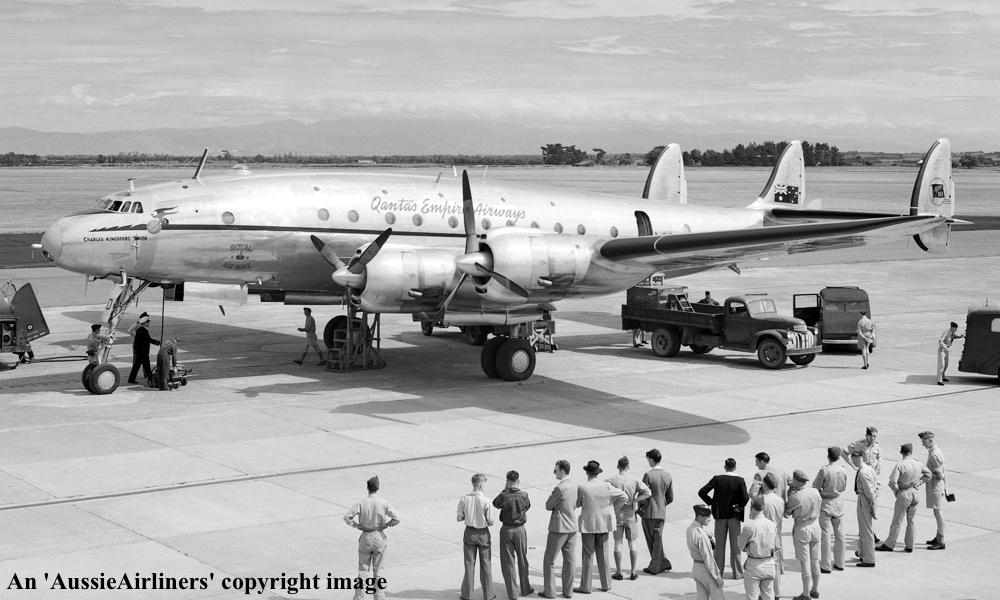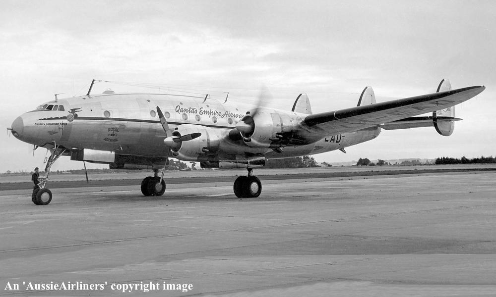 VH-EAD. Qantas Empire Airways - 'Charles Kingsford Smith' in the original livery at Auckland Whenuapai Airport, date unknown. (R. N. Smith Collection Copyright Image 1802-039.) |
