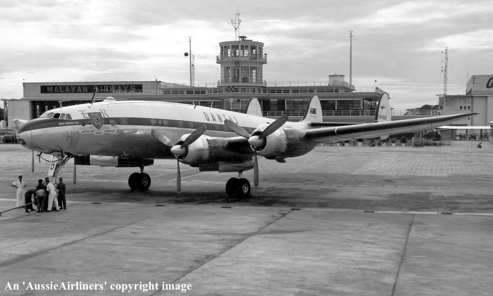 VH-EAD. Qantas - 'Charles Kingsford Smith' in the revised livery with additional 'Coronation Service' titles at Singapore Changi Airport, circa 1953. (Qantas Heritage Collection Copyright Image 1802-070.) |