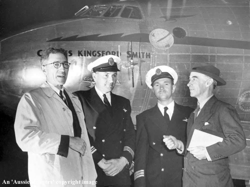 VH-EAD. Qantas Empire Airways - 'Charles Kingsford Smith' in the original livery at the Lockheed Burbank plant, October 1947. Left to Right: Hudson Fysh; Capt Furze; Capt Bert Ritchie; Scotty Allen. (Qantas Heritage Collection Copyright Image 1802-088.) |