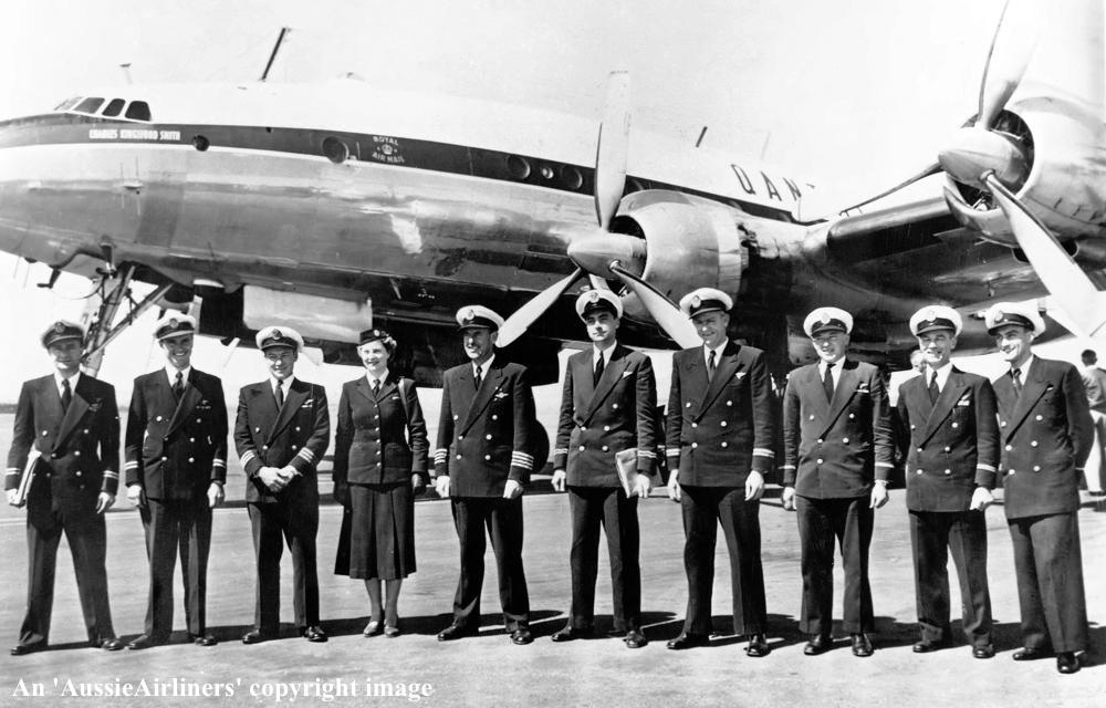 VH-EAD. Qantas - 'Charles Kingsford Smith' in the revised livery at Palmietfontein Airport, September 04, 1952. The crew of the inaugural Australia - South Africa service. L to R: N/O Greg Parsons; F/O Harry Shaw; Capt Ron Uren; F/H Marge de Tracy; Capt Ken Jackson; R/O Jim Delaney; E/O Ern Manning; E/O Bruce Lawrence; F/S Harold Smith; F/S Charles Tishler. (Qantas Heritage Collection Copyright Image 1802-214.) |