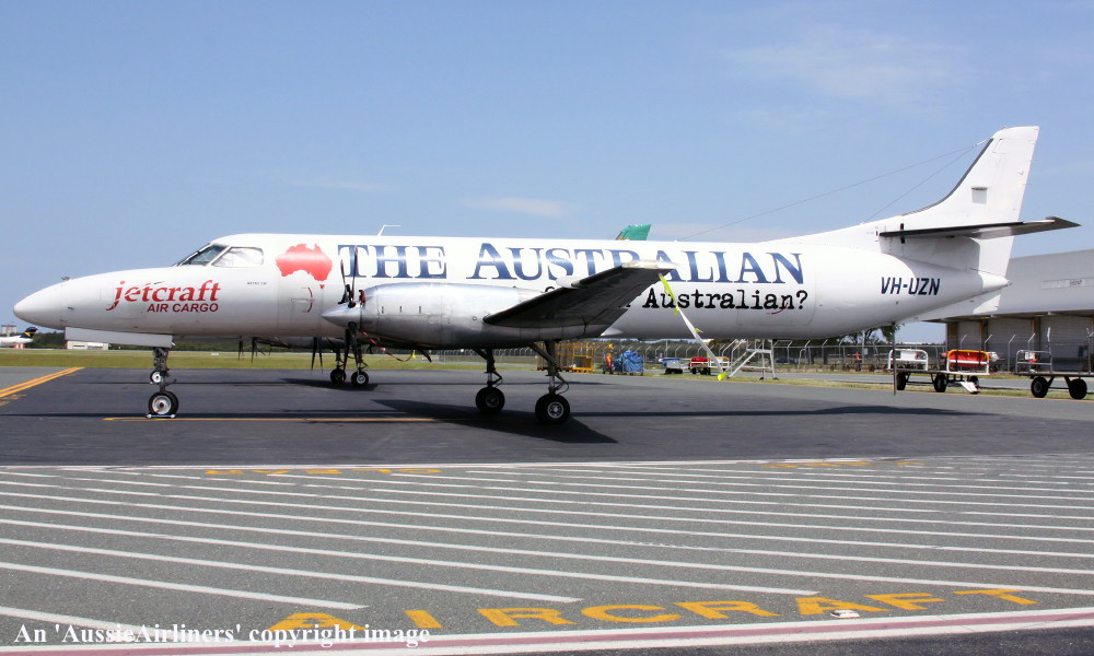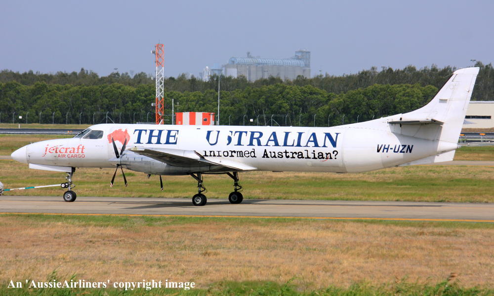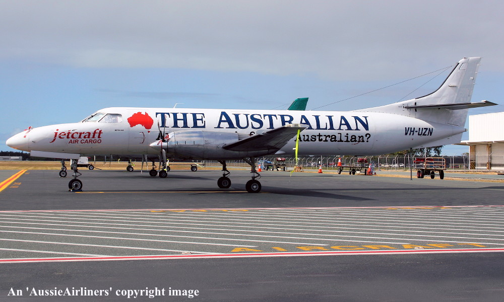 VH-UZN. Jetcraft Air Cargo - in the standard livery with additional 'The Australian' titles at Brisbane Airport, December 13, 2008. (R. N. Smith Collection Copyright Image 1040-252.) |