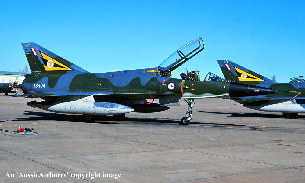 A3-104. Royal Australian Air Force - in the camouflage livery with the 'No 2 OCU' tail badge at an unknown airport, June 1983.