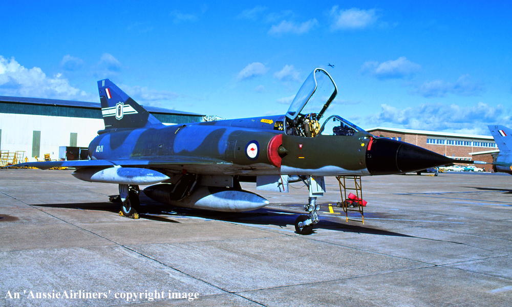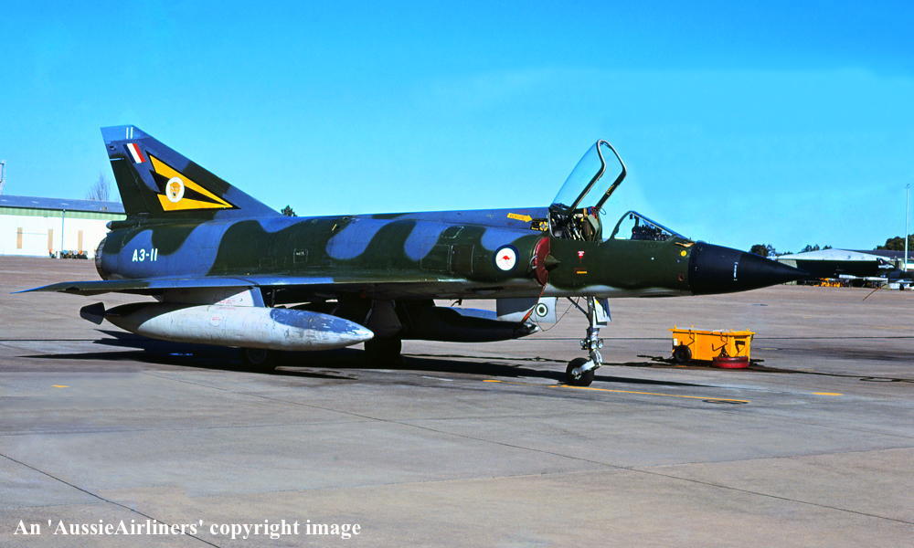 A3-11. Royal Australian Air Force - in the camouflage livery with the 'No 2 OCU' tail badge at an unknown airport, June 1983. (R. N. Smith Collection Copyright Image 2600-128.) |