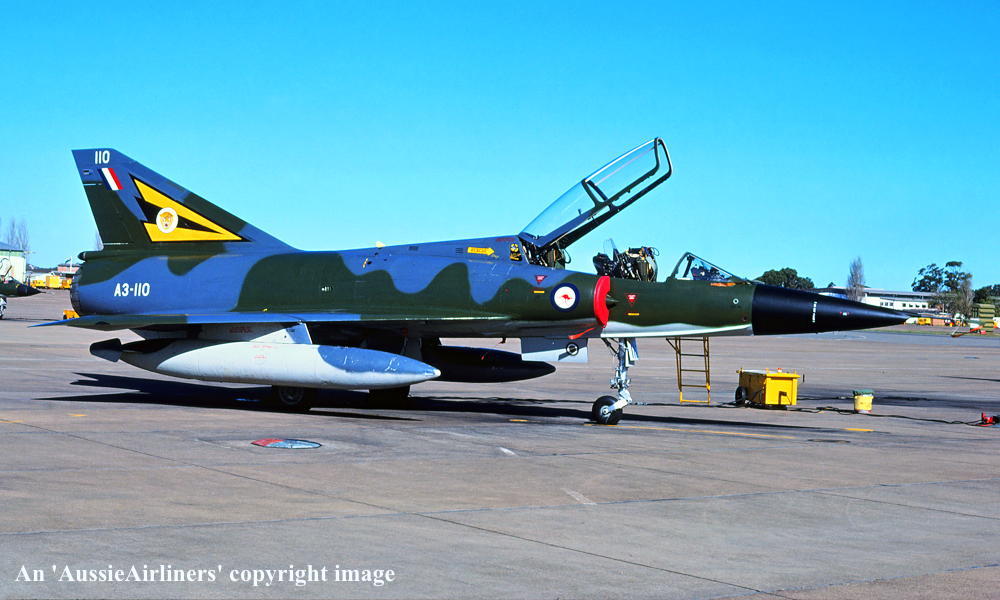 A3-110. Royal Australian Air Force - in the camouflage livery with the 'No 2 OCU' tail badge at Newcastle Williamtown Airport, June 1983.