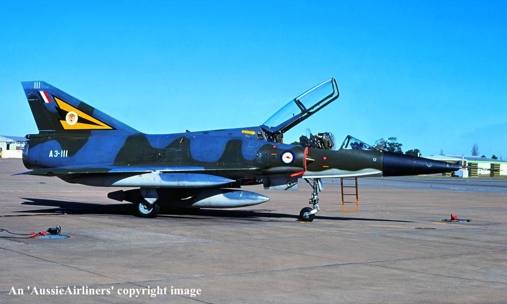 A3-111. Royal Australian Air Force - in the camouflage livery with the 'No 2 OCU' tail badge at an unknown airport, June 1983.