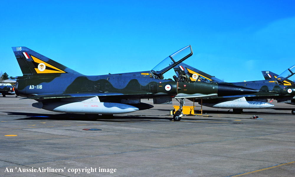 A3-116. Royal Australian Air Force - in the camouflage livery with the 'No 2 OCU' tail badge at an unknown airport, June 1983.