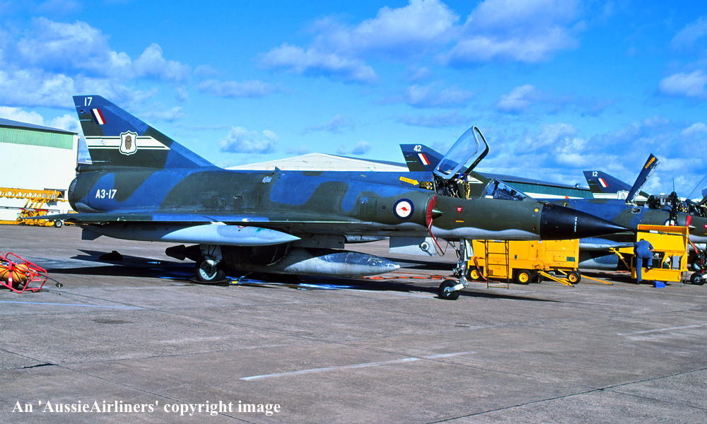 A3-17. Royal Australian Air Force - in the camouflage livery with the 'No 77 Squadron' tail badge at an unknown airport, July 1987.