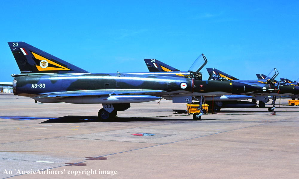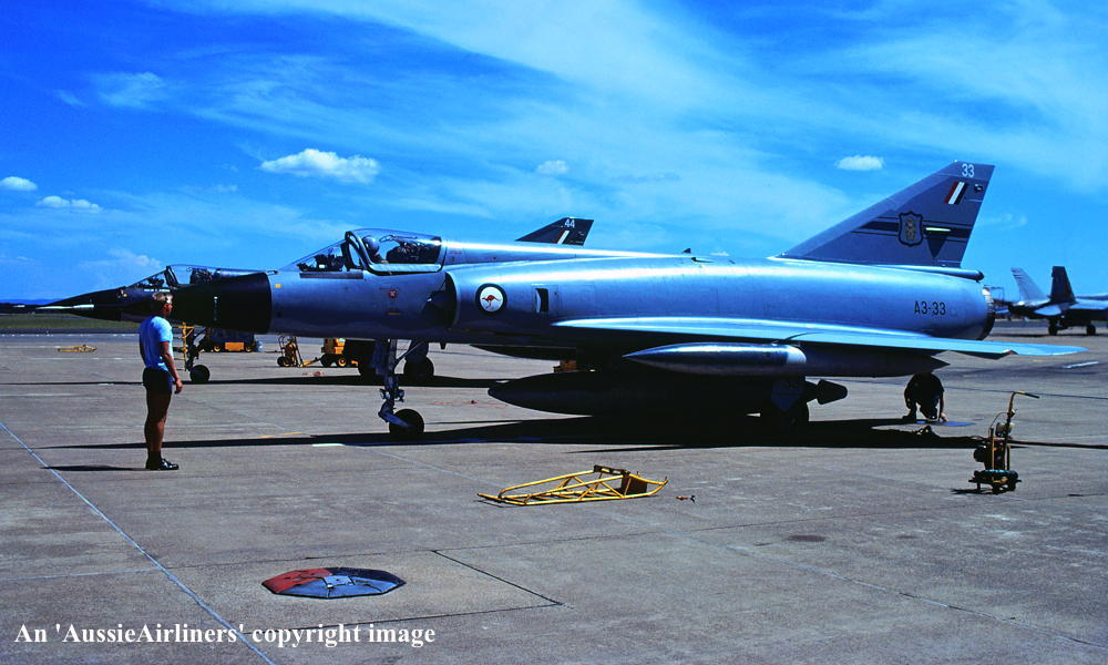 A3-33. Royal Australian Air Force - in the camouflage livery with the 'No 2 OCU' tail badge at an unknown airport, November 1980. (R. N. Smith Collection Copyright Image 2600-129.) |