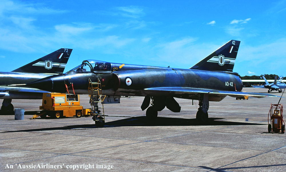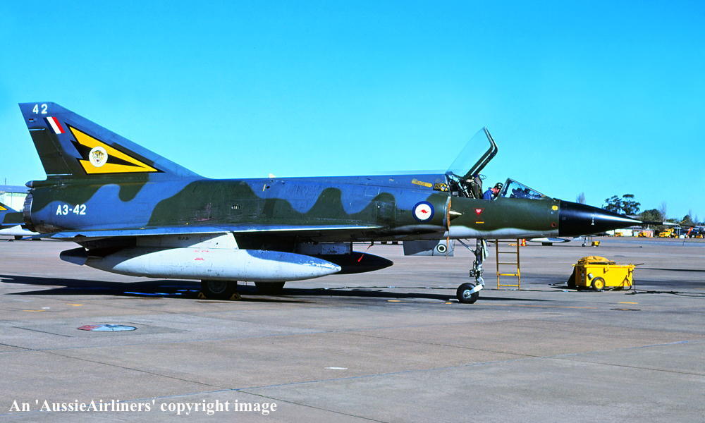 A3-42. Royal Australian Air Force - in the camouflage livery with the 'No 2 OCU' tail badge at Newcastle Williamtown Airport, June 1983. (R. N. Smith Collection Copyright Image 2600-131.) |