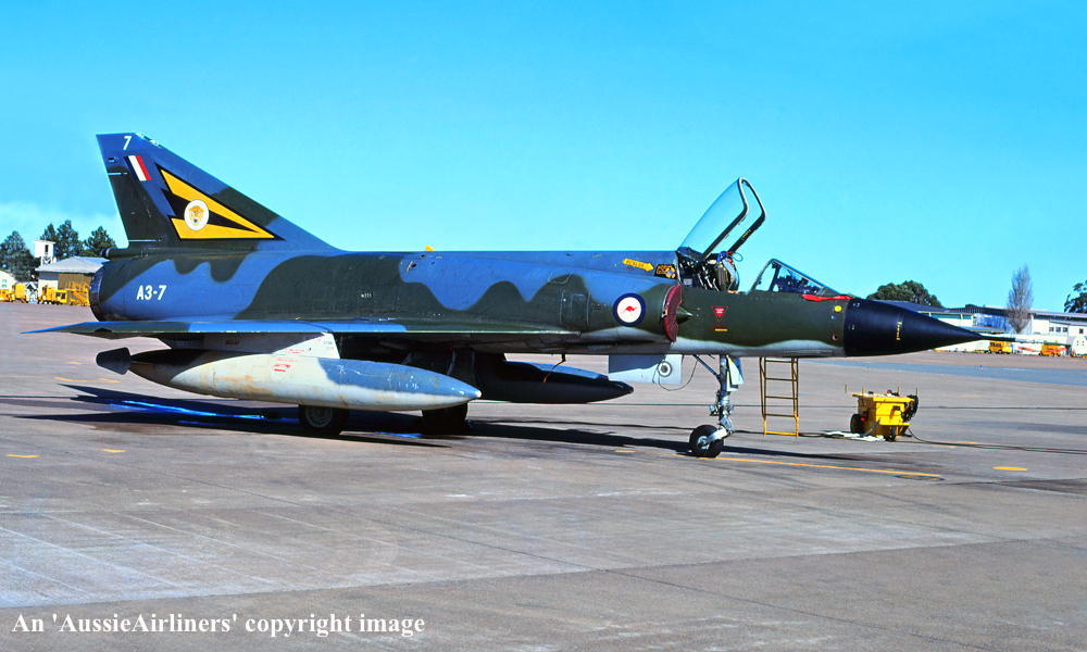 A3-7. Royal Australian Air Force - in the camouflage livery with the 'No 2 OCU' tail badge at Williamtown Airport, June 1983.