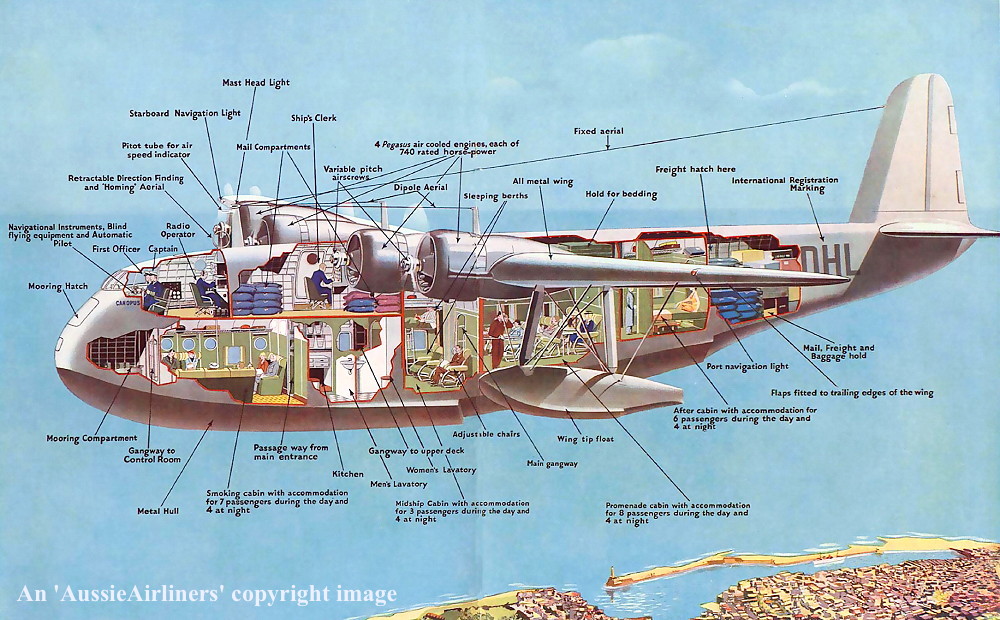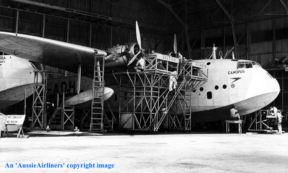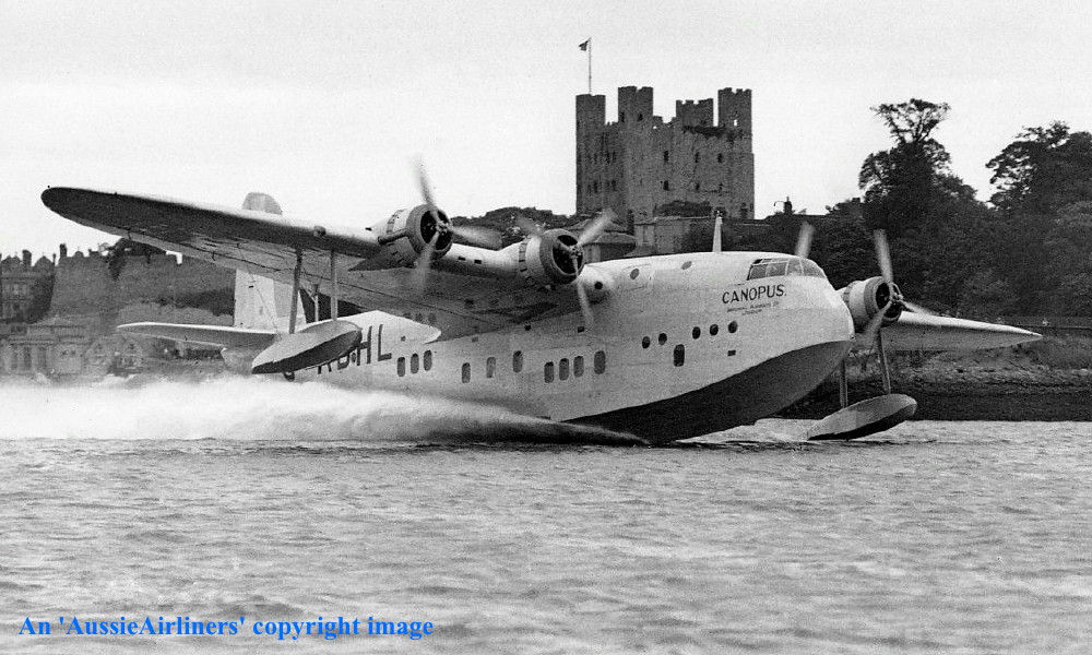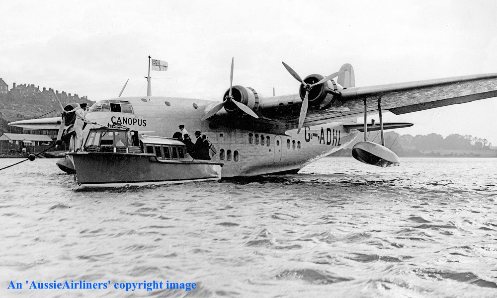This was the first Empire boat to be completed and flown by Short Bros at Rochester, Kent The order was placed by Imperial Airways, London - January 24, 1935 The official written order shows the cost of the aircraft at UKP 37,800 - February 19, 1935 Converted to present day values this would be approximately UKP 3,417,876 Built as an S.23 Empire Class Mk.1 flying boat having 920 h.p. Bristol Pegasus Xc poppet-valve radial engines It was sometimes referred to as the 'prototype' Empire flying boat but this was incorrect It was always intended from the very beginning that it would be an 'active-working' aircraft It was fitted with the 'Type 1' fuel system - consisting of two fuel tanks of 326 gallons each The fuel tanks were mounted in the wing, positioned between the inner and outer engine This provided a flight duration of approximately 5 hours Its range in still air was 684 nm (1,270 km) or against a 35kt headwind the range was 517 nm (960 km) Entered onto the British Aircraft Register as G-ADHL (CofR 5881) - June 17, 1935 Registered to Imperial Airways Ltd, Victoria Station, London It was allocated a 'Fleet Number' (No. 1) which was used in all operational records to identify the aircraft Launched on the Medway River at Rochester without cabin fittings - July 02, 1936 The aircraft was named 'Canopus' Taxy trials carried out by the Short Brothers' Chief Test Pilot, John Lankester Parker - July 03, 1936 However as the aircraft had performed so well he decided to take-off and flew over Rochester for 14 minutes This was its unofficial 'first flight' A minor problem with the operation of the aircraft's flap system was encountered and this was quickly solved The official 'first flight' as 'G-ADHL' ( John L. Parker) flown - July 04, 1936 Test flown (one hour) to confirm that all minor identified issues had been rectified - July 06, 1936 During its fourth test flight (J. L. Parker) an engine failed during the 'take-off' run - July 10, 1936 The take-off was continued, climbed to required altitude, circled and returned to alight without further incident Position error checks conducted - July 13, 1936 During the next 6 - 7 weeks 'Canopus' underwent stringent testing of all systems and equipment to ensure that the design of the aircraft was robust and it would perform in accordance with the written specifications Test flown (Rochester) at 'full-load' weight - September 09, 1936 Following this flight the aircraft was beached for the interior 'fit-out' and 'furnishing' of the passenger cabins Relaunched at Rochester - September 17, 1936 Test flown (Major Herbert Brackley - Air Superintendent of Imperial Airways) - September 18 & 19, 1936 Test flown (J. L. Parker) with passengers - October 05, 1936 Passengers included: Lord Swinton (Minister for Air); Sir Edward Ellington (Chief of Air Staff); and their parties Test flown / demonstration flight (J. L. Parker) - October 06, 1936 Passengers included: Directors of Imperial Airways including Sir Eric Geddes and Sir John Reith Test flown (J. L. Parker) to test the Sperry auto-pilot to invited guests - October 06, 1936 Passengers included: Sir Samuel Hoare (the First Lord) and the Board of the Admiralty and guests Test flown (J. L. Parker) for fuel consumption test - October 09, 1936 Following this test flight the aircraft underwent the final fit-out prior to 'introduction to service' Test flown (J. L. Parker) for 20 minutes - October 20, 1936 The Certificate of Airworthiness (CofA No. 5694) issued - October 20, 1936 Two test flights flown (Major H. Brackley) - October 20, 1936 Following these test flights Major Brackley officially accepted the aircraft's Certificate of Airworthiness and took delivery of 'Canopus' on behalf of Imperial Airways Departed Rochester (Major H. Brackley) on its first route-proving flight to Caudebec (France) - October 22, 1936 On arrival at Caudebec the aircraft was delayed by bad weather Flown Caudebec - Hourtin - October 24, 1936 Flown Hourtin - Marseilles - Rome (Lake Bracciano) - October 25, 1936 Flown Rome (Lake Bracciano) - Brindisi - October 26, 1936 Flight crew: Captain F. J. (Frank) Bailey; F/O S. Long Flown Brindisi - Athens - Mirabella - Alexandria - October 27, 1936 Flight crew: Captain F. J. (Frank) Bailey; F/O S. Long Operated its first scheduled Empire Flying Boat service Alexandria - Brindisi as Flight IW490 - October 30, 1936 Flight crew: Captain F. J. (Frank) Bailey; F/O S. Long Whilst operating Athens - Alexandria as Flight AS412 the aircraft suffered an engine fire - January 10, 1937 The P.I.C. elected to make an emergency landing onto the Mediterranean Sea near Crete The aircraft was then taxied to the nearest port - Mirabella (Crete) The burnt-out engine was removed and a metal cocoon was fabricated and fitted to the engine's position It departed Mirabella on the ferry flight to England via Macon (France) for repairs - January 29, 1937 Repaired and returned to service Hythe - Alexandria as Flight IE531 - March 14, 1937 Operated its inaugural Southampton - Durban service as Flight AS453 - June 02 - 08, 1937 Flight crew: Capt. E. H. G. Attwood It carried 5 passengers and 1,032 pounds (469 kg) of mail on this flight This aircraft was part of the aircraft pool operated by Imperial Airways and Qantas Empire Airways on services between Southampton, England and Sydney, Australia Qantas Empire Airways crews flew the aircraft on the Sydney - Singapore - Sydney sector of this route between July 1938 and October 15, 1941 Qantas Empire Airways crews then took over the Singapore - Karachi - Singapore sector of the route from October 15, 1941 to February 15, 1942 when operations ceased due to Japanese war activities in South-East Asia Following the outbreak of World War II, 'Canopus' and all the other Empire Flying Boats were placed under the jurisdiction of 'National Air Communications' - August 31, 1939 Imperial Airways and the original British Airways were merged to form British Overseas Airways Corporation - April 01,