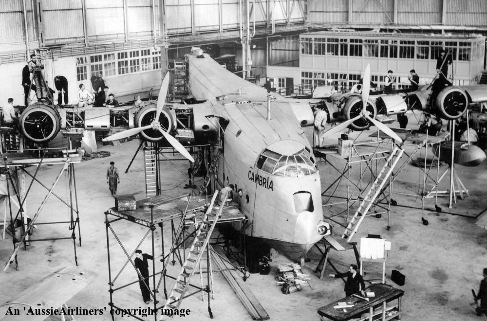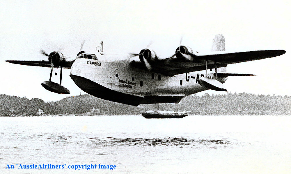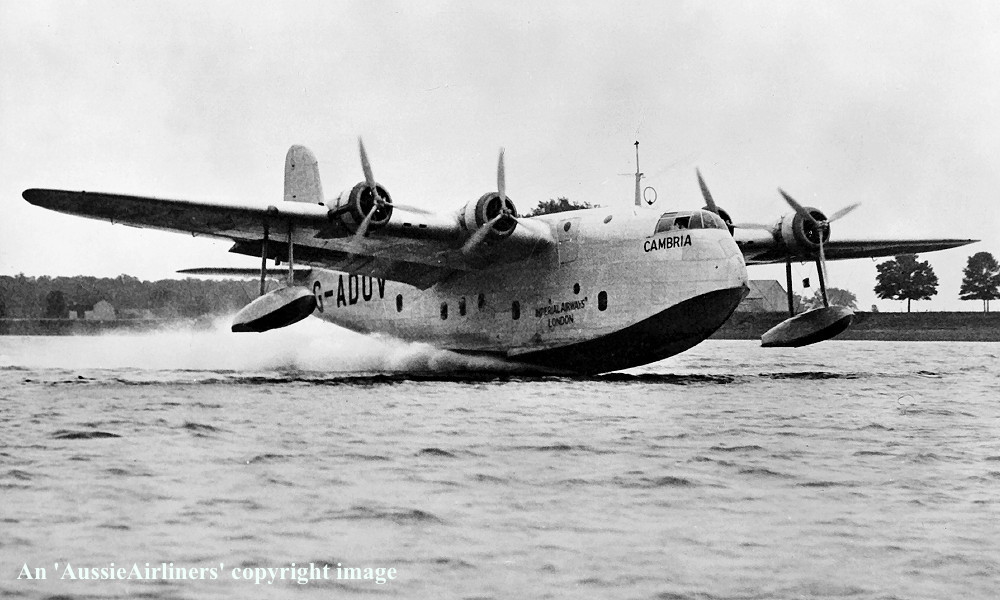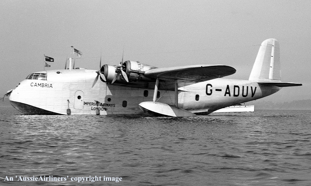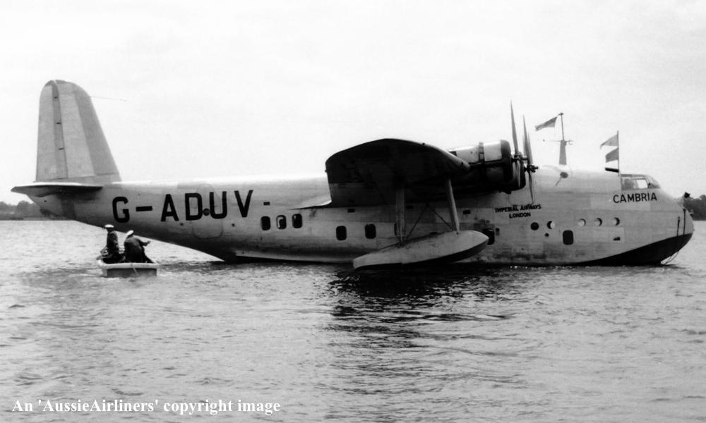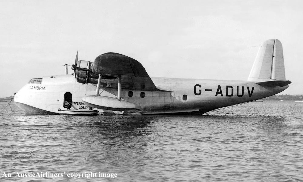 This aircraft was the sixth Empire boat to be completed and flown by Short Bros at Rochester, Kent The order was placed by Imperial Airways, London - January 24, 1935 The official written order shows the cost of the aircraft at UKP 37,800 - February 19, 1935 Converted to present day values this would be approximately UKP 3,417,876 Built as an S-23 Empire Class Mk.III flying boat having 920 h.p. Bristol Pegasus Xc poppet-valve radial engines It was the 2nd 'long-range' S.23 boat and was often referred to as a 'Atlantic' boat It was fitted with the 'Type M1B' fuel system - consisting of two fuel tanks of 326 and 2 tanks of 179 gallons mounted within the wings plus 2 hull-mounted tanks of 280 gallons each - for a total fuel capacity of 2,330 gallons This provided a flight duration of approximately 17 hours 40 minutes Its range in still air was 2,754 nm (5,110 km) or against a 35 kt headwind the range was 1,911 nm (3,545 km) Entered onto the British Aircraft Register as G-ADUV (CofR 6376) - October 07, 1935 Registered to Imperial Airways Ltd, Victoria Station, London It was allocated a 'Fleet Number' (No. 5) which was used in all operational records to identify the aircraft This aircraft should have been allocated 'Fleet No. 6' as 'G-ADUW - Castor' was launched 27 days before this aircraft, but it was never corrected Launched on the Medway River at Rochester without cabin fittings - January 11, 1937 The aircraft was named 'Cambria' First flown at Rochester by the Short Brothers' Chief Test Pilot, John Lankester Parker - January 11, 1937 Certificate of Airworthiness (CofA No. 5750) issued - January 15, 1937 Delivered to Imperial Airways, London - January 21, 1937 It was immediately pressed into service operating Hythe - Alexandria - January 21, 1937 It carried engineers, a spare engine and other associated equipment in order that repairs could be carried out on G-AHDL 'Canopus' that had suffered an engine fire near Crete It operated a special long-distance non-stop flight Hythe - Hythe - February 22, 1937 Route: Hythe - South London (08:30) - Colchester (09:05) - Great Yarmouth (09:35) - Grimsby (10:05) - South Shields (10:30) - Berwick (11:00) - Edinburgh (12:05) - Glasgow (12:45) - Belfast (13:30) - Kingsdown / Dublin (14:35) - St. David's Head, Pembrokeshire (15:05) - Worm's Head, Swansea (15:35) - Taunton (16:05) - Bournemouth (16:35) - Hythe (16:47) The aircraft was under the command of Captains G. J. Powell and E. N. Gurney 'Cambria' operated a special flight Hythe - Foynes (Ireland) - February 25, 1937 From Foynes it then made several short flights to test this location's suitability as the new 'Atlantic Airport' on the mouth of the Shannon River Wireless, meteorological and general 'ground' organisation and handling was tested These 'technical' tests were intended to be a preliminary run for the 'experimental' flights that would be carried out later between Ireland and Newfoundland 'Cambria' carried six crew under the command of Capt. G. J. Powell; acting F/O Capt. E. M. Gurney; 4 passengers It departed Hythe on a special survey flight to South Africa (Durban) - April 26, 1937 It arrived South Africa (Durban) - May 29, 1937 Route flown: Hythe - Marseilles - Alexandria - Cairo - Luxor - Wadi Halfa - Kareima - Khartoum - Kosti - Malakal - Laropi - Butiaba (Lake Albert) - Port Bell - Kisumu (Kenya) - Mombasa - Dar-Es-Salaam - Lindi - Mozambique - Quelimane - Beira - Durban Radio equipment that was carried on this flight was installed at the various coastal towns as the flight progressed 'Cambria' returned to Hythe after making the non-stop flight from Alexandria - June 04, 1937 Non-stop distance: 2,300 miles; flight time: 15 hours 35 minutes 'Cambria' operated a special flight Hythe - Lisbon to survey the first leg of the proposed route to Horta (The Azores) - July 06 - 11, 1937 It operated its first experimental flight to New York (Port Washington) as 'Experimental Flight 2' - July 1937 Departed Hythe (14:58) on the first leg to Foynes (Ireland) - July 27, 1937 Crew: Capt. G. J. Powell; F/O C. F. Elder; R/Os P. A. Woods; J. M. Lewis Departed Foynes (18:00) on the flight to New York - July 29, 1937 Flight time Foynes - Botwood: 17 hours 35 minutes It arrived at New York (Port Washington - 15:55 GMT) - August 02, 1937 Route: Hythe - Foynes - Botwood - Montreal - New York It departed New York (Port Washington - 15:14 GMT) on the return flight to Hythe - August 06, 1937 It arrived at Hythe (16:01 GMT) on completion of this experimental flight - August 09, 1937 Route: New York - Montreal - Botwood - Foynes - Hythe Flight time Botwood - Foynes: 11 hours 55 minutes It operated its second experimental flight Foynes - New York (Port Washington) - August 26, 1937 Crew: Capt. G. J. Powell; F/O C. F. Elder; R/Os P. A. Woods; H. Dangerfield It was damaged whilst alighting at Toronto when it struck an unknown submerged object This happened during the special 'Goodwill Tour of Canada' during this 2nd trip Engineers and replacement parts were were shipped to New York then transported to Toronto to repair the damage It returned New York (Port Washington) - Foynes - September 28, 1937 Flight time: 10 hours 38 minutes Following the second successful experimental flight to New York 'Cambria' was fitted with 'in-flight refuelling' equipment and carried out a comprehensive program of 'in-flight' refuelling tests in conjunction with the Armstrong Whitworth AW.23 aircraft (K3585) Fuel was first successfully transferred between the two aircraft - January 20, 1938 'Cambria' was converted to full 'Mk I' Empire Flying Boat configuration at the Folland Aircraft Factory at Hamble in preparation for its commencement of commercial operations It officially entered commercial service operating service DS93 - May 18, 1938 Route: Southampton - Kisumu (Kenya) Due to fuel starvation 'Cambria' was force landed at Kroosi Bay (Mozambique) - March 08, 1939 It was then towed some 26 miles to Mozambique Island for repairs Imperia