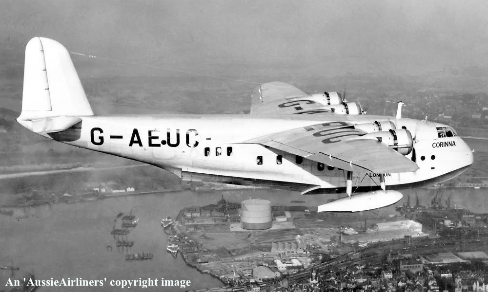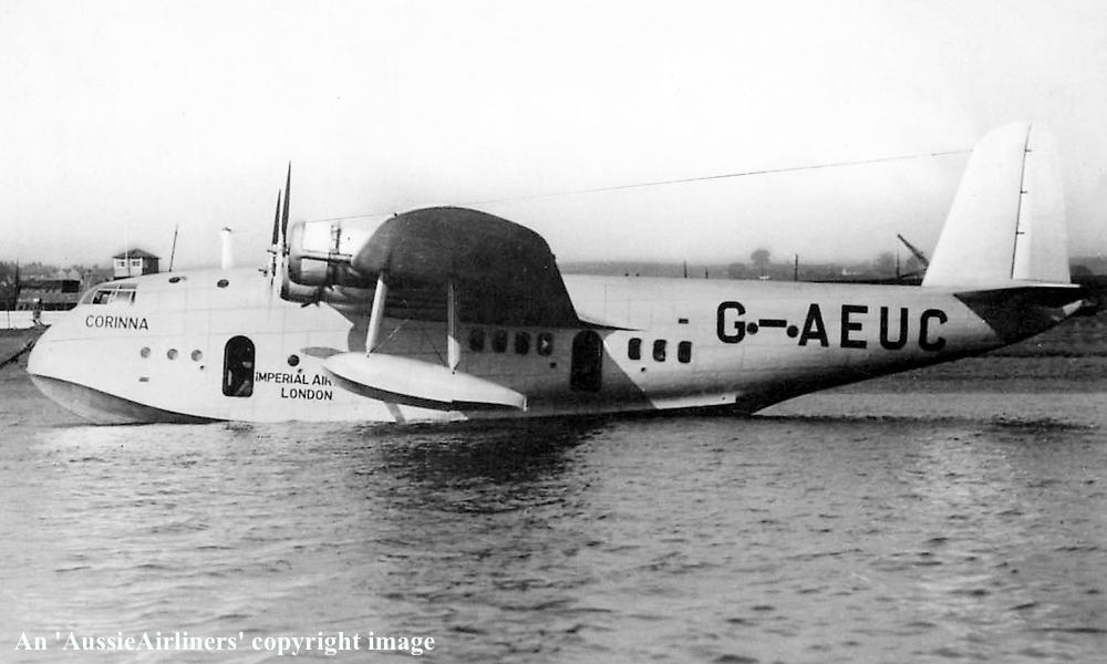 This aircraft was the twenty-second Empire boat completed and flown by Short Bros at Rochester, Kent The order was placed by Imperial Airways, London - September 02, 1935 It was completed as an S-23 Empire Class boat having 920 h.p. Bristol Pegasus Xc engines The standard fuel capacity was 650 gallons It had an all-up weight of 40,500 lbs (18,380 kg) which was later increased to 53,000 lbs (24,200 kg) The cruising speed was 164 m.p.h. with a standard range of 760 miles / 1,245 km First flown as G-AEUC - September 24, 1937 Certificate of Registration Issued - September 25, 1937 Delivered to Imperial Airways, London - September 30, 1937 The aircraft was named 'Corinna' Transferred to British Airways when Imperial Airways merged - April 01, 1940 It was isolated in eastern sector of Horseshoe Route when Japan occupied Malaya - February 1942 The Horseshoe Route connected Sydney and Durban, South Africa via East Africa, India and Malaya The aircraft was taken over and operated by Qantas Empire Airways - 1942 It was destroyed during the Japanese bombing of Broome, Western Australia - March 03, 1942 It was trapped on the water awaiting refuelling when the bombing raid commenced Flight crew: Captain L. Ambrose |
