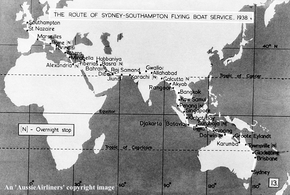 Qantas Empire Airways - the route map depicting the journey by Short S.23C Empire Class flying boat from Sydney to Southampton in 1938. (R. N. Smith Collection Copyright Image 2545-224.) |