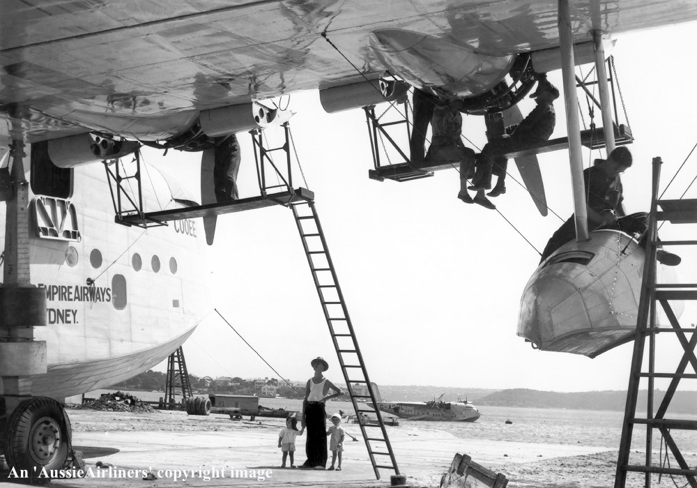 VH-ABF. Qantas Empire Airways - 'Cooee' in the standard livery at Rose Bay Sydney, November 1938. (Qantas Heritage Collection Copyright Image 2545-240.) |