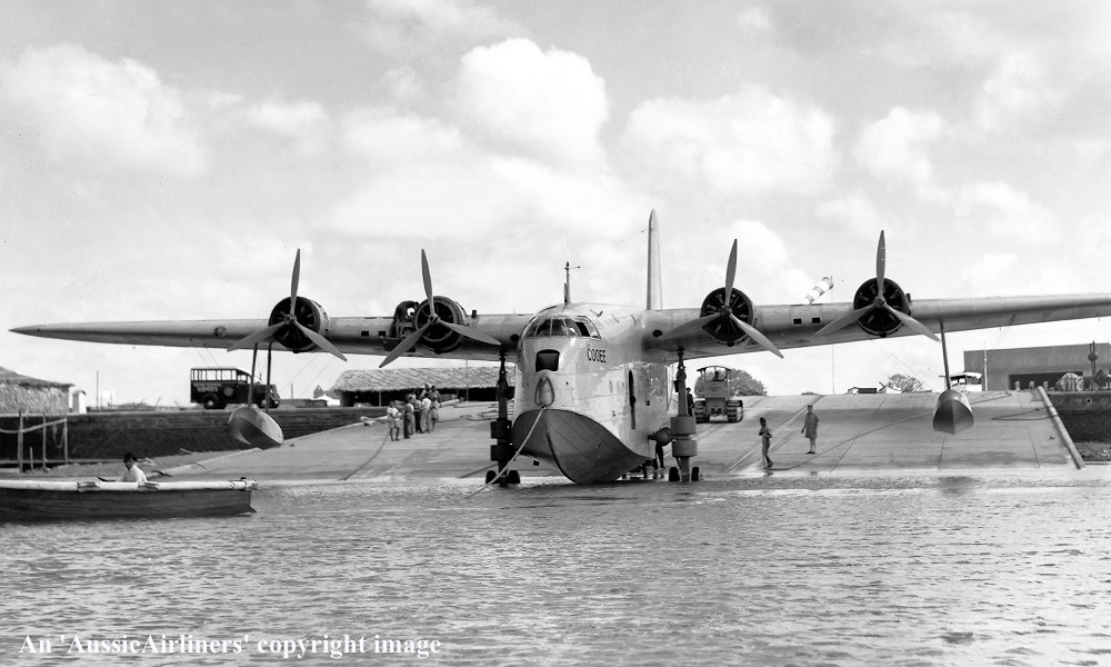 This aircraft was the thirty-first 'Empire' boat to be completed and flown by Short Bros at Rochester, Kent The order was placed by Imperial Airways, London - June 22, 1937 It was completed as a S-23C 'Empire' Class boat with 920 h.p. Bristol Pegasus Xc engines The standard fuel capacity was 650 gallons It had an all-up weight of 40,500 lbs (18,380 kg) which was later increased to 53,000 lbs (24,200 kg) The cruising speed was 164 m.p.h. with a standard range of 760 miles / 1,245 km Entered onto the British Aircraft Register as G-AFBL (CofR 8072) - August 26, 1937 Registered to Imperial Airways Limited, London The British registration was not painted on this aircraft Launched as 'VH-ABF' at the Short Bros Seaplane Works, The Medway, Rochester - March 03, 1938 First flown as 'VH-ABF' - March 28, 1938 The Certificate of Airworthiness (CofA) Issued - March 30, 1938 Delivered to Imperial Airways, London - March 30, 1938 The aircraft was named 'Cooee' This airframe was earmarked for delivery to Qantas Empire Airways from the outset Sold to Qantas Empire Airways - April 20, 1938 Departed Southampton on the delivery flight to Australia - April 20, 1938 It arrived at Brisbane on completion of the delivery flight - May 01, 1938 It was the second 'Empire Class' flying boat delivery to Qantas Empire Airways Entered onto Australian Aircraft Register as VH-ABF (CofR 705) - May 20, 1938 Registered to Qantas Empire Airways Ltd, Brisbane Operated the inaugural Sydney - Southampton service as IW668 (Captain P. Lynch Blosse) - July 05, 1938 This aircraft was part of the aircraft pool operated by Imperial Airways and Qantas Empire Airways on services between Southampton, England and Sydney, Australia Qantas Empire Airways crews flew the aircraft on the Sydney - Singapore - Sydney sector of this route between July 1938 and October 1941 Qantas Empire Airways crews then took over the Singapore - Karachi - Singapore sector of the route from October 1941 to February 1942 when operations ceased due to Japanese war activities in South-East Asia Flew the United Kingdom - West Africa - Congo - Durban route (Captain F. J. Bailey) - April 1940 This aircraft was isolated in the western sector of Horseshoe Route - February 1942 G-AFPZ 'Clifton' had been isolated in Australia when 'Horseshoe' route was cut during World War II Ownership was transferred to British Overseas Airways Corporation in exchange for 'G-AFPZ' - July 13, 1942 Entered onto the British Aircraft Aircraft Register as G-AFBL (CofR 8072/2) - July 13, 1942 Cancelled from the Australian Aircraft Register - August 11, 1942 Withdrawn from use by B.O.A.C. - February 02, 1947 Cancelled from the British Aircraft Register - March 07, 1947 Broken up for scrap at Hythe, Southampton - March 24, 1947 The aircraft had flown a total of 14,307 hours |
