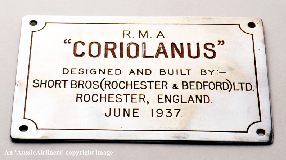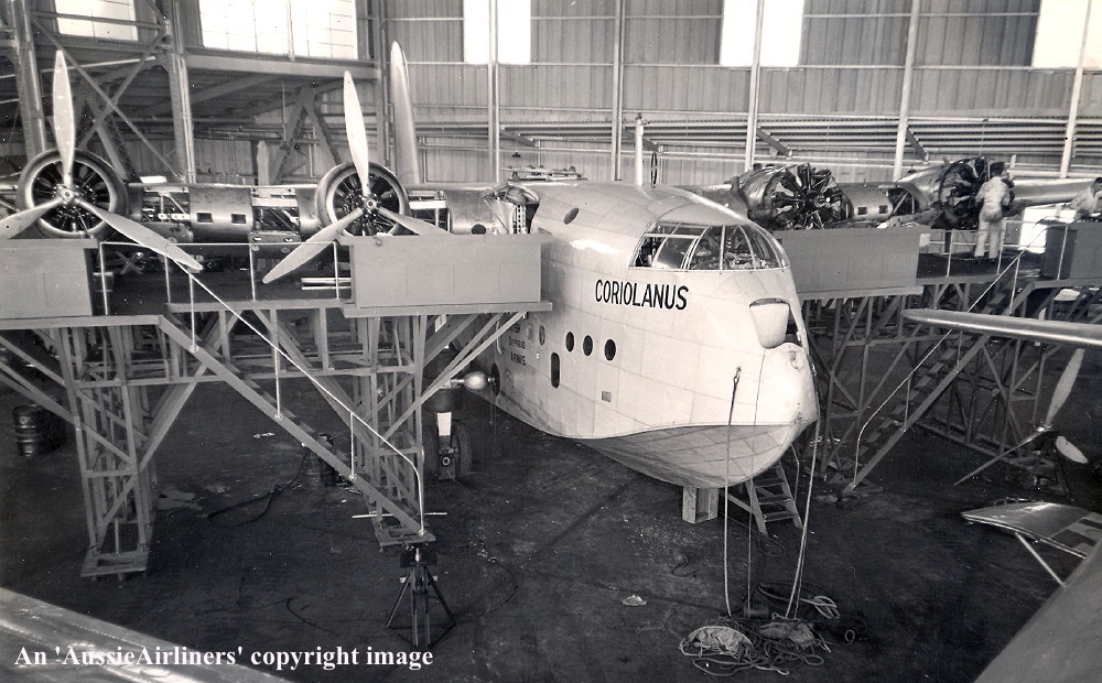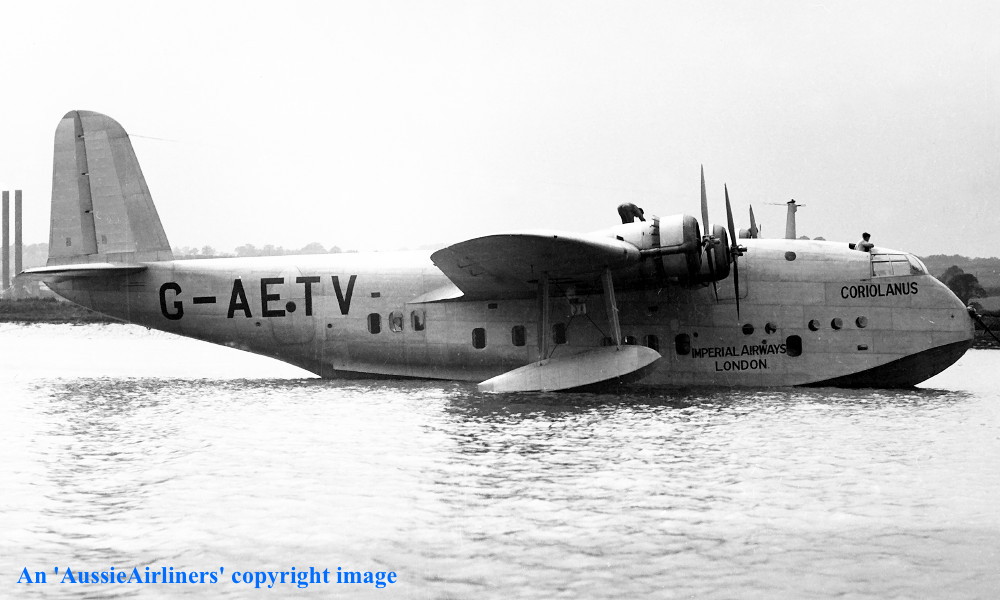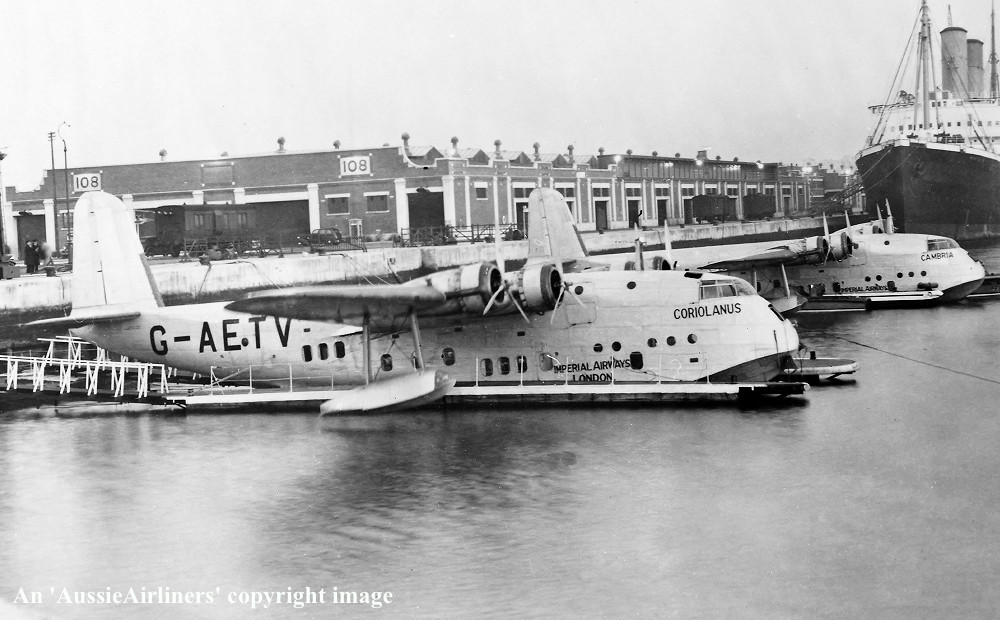 G-AETV. Imperial Airways London - 'Coriolanus' in the standard livery at Southampton Dock, February 1939. (Qantas Heritage Collection Copyright Image 2545-363.) |