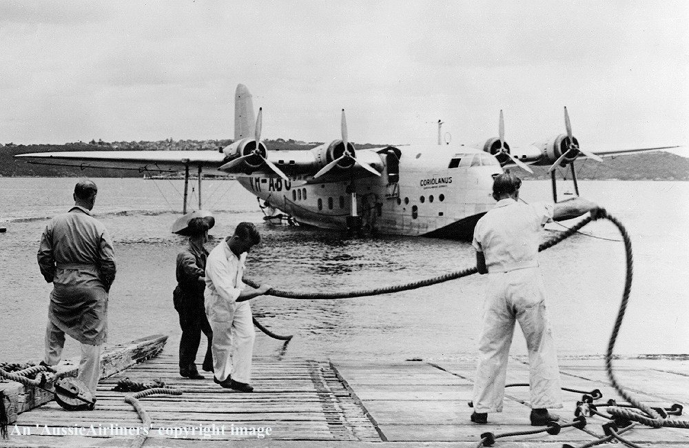 G-AETV. British Overseas Airways - 'Coriolanus' in the standard livery at Rose Bay, Sydney, date unknown. (P. Sheehan Collection Copyright Image 2545-857.) |