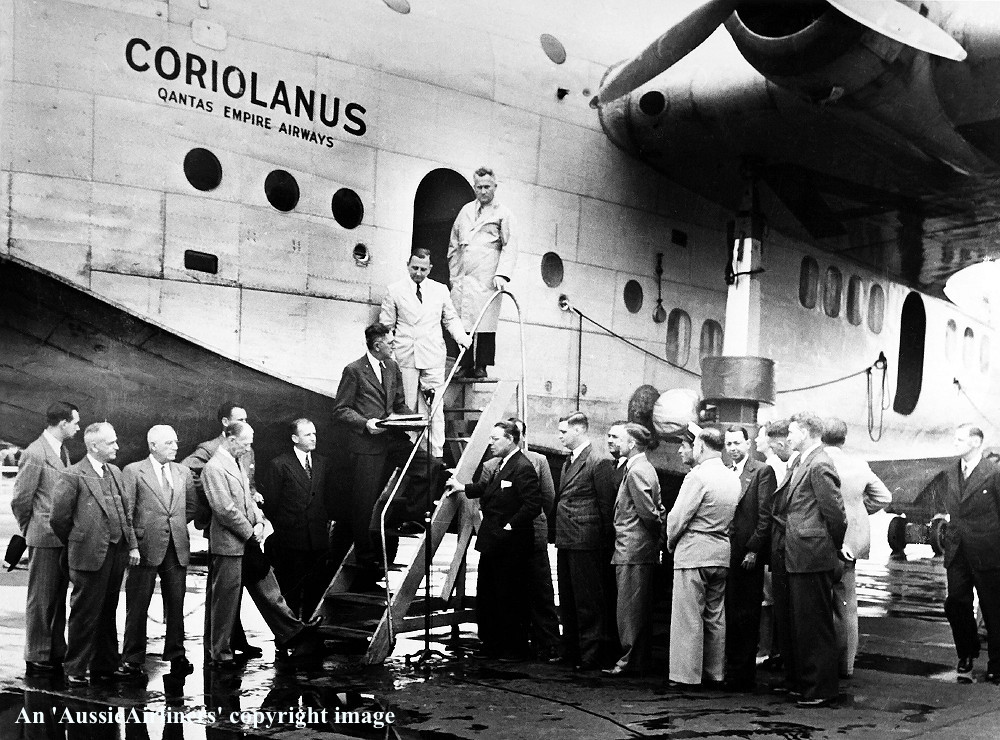 VH-ABG. Qantas Empire Airways - 'Coriolanus' in the standard livery at Sydney Rose Bay, January 08, 1948. The aircraft's logbooks and nameplate are accepted by Mr W. Hudson Fysh from Captain W. Crowther. (Qantas Heritage Collection Copyright Image 2545-245.) |