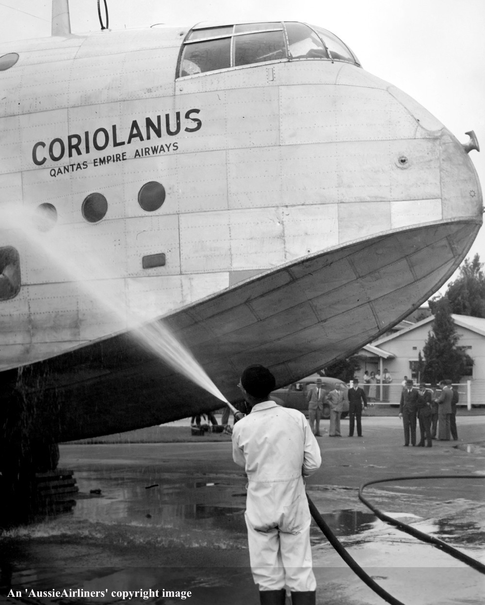VH-ABG. Qantas Empire Airways - 'Coriolanus' nameplate at Sydney Rose Bay, January 08, 1948. (Qantas Heritage Collection Copyright Image 2545-365.) |