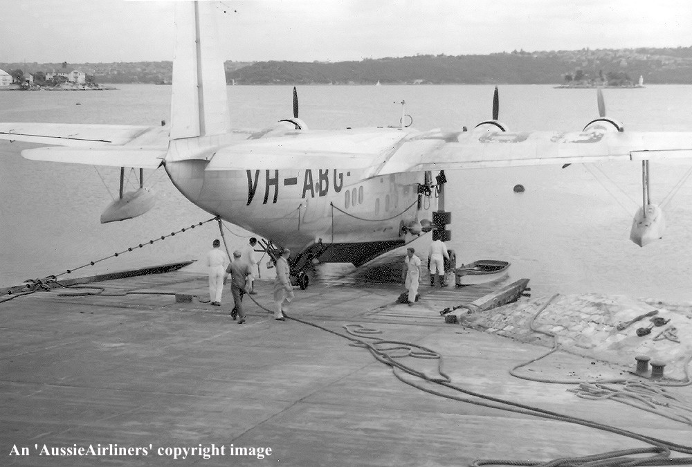 VH-ABG. Qantas Empire Airways - 'Coriolanus' in the standard livery at Sydney Rose Bay, January 08, 1948. Mr R. Banks supervises the beaching of the aircraft for the last time. (Qantas Heritage Collection Copyright Image 2545-244.) |