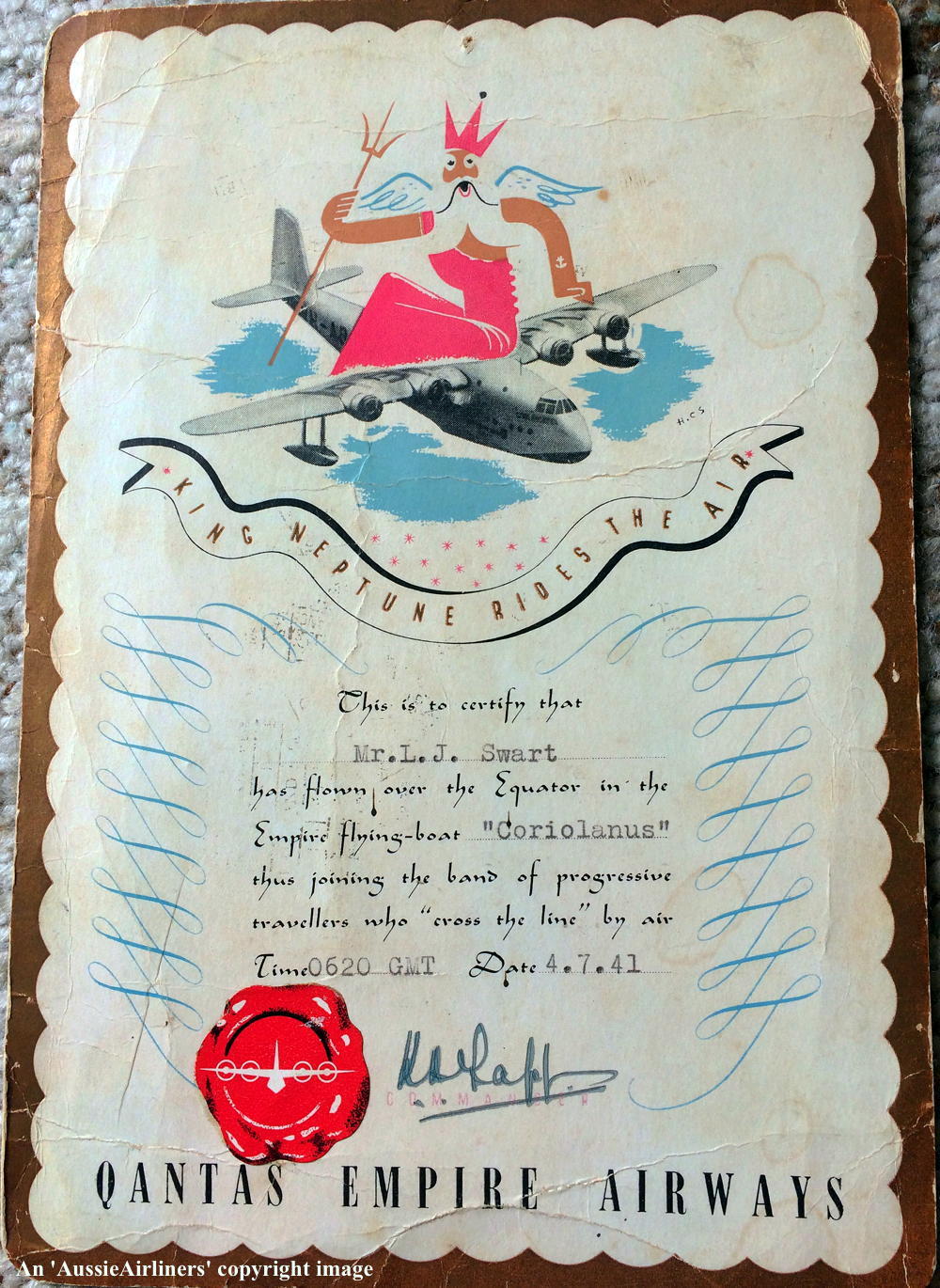 G-AETV. Qantas Empire Airways - 'Coriolanus' - the 'King Neptune Certificate for Crossing the Equator', July 04, 1941. This certificate was issued to Laurens J. Swart, Chief Steward, who was transferring from the Dutch vessel M.S. Johan van Oldenbarnevelt to the M.S. Marnix van St. Aldegonde on Flight WS100 from Sourabaya to Singapore. (E. Vermeulen Collection Copyright Image 2545-935.) |